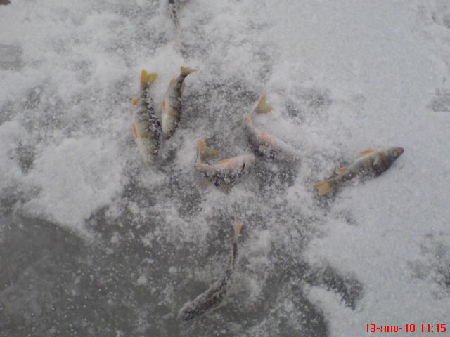 Сегодня решил свозить тестя с тещей:1072: потягать окушка... На водоеме были примерно в 9:00.Первые 20 минут поклевок не было вообще.У меня мимо воли начало немного жым-жым...Так расхвалил водоем а клева на нем нет.Прошло немного времени и я подобрал нужную проводку:несколько постукиваний мормышкой по дну,а потом интенсивная игра с быстрым подъемом.Большинство поклевок были возле самого берега перед кустами.Стали попадатся неплохие лунки из которых удавалось поймать по 5-10 матросов.У тестя с тещей откровенно клевало слабо,пока они не сменили место лова. Погодка была отличной Постепенно клев начал стихать,пока практичесски не прекратился и мы решили прекратить рыбалку. В итоге,у меня около 2 кг окуня,а у родственников примерно по 1кг.С учетом того,что знакомые на Горыни не видели не одной поклевки,то мы неплохо порыбачили. Спасибо за внимание!!! З.Ы:Пожалуйста,будьте внимательны завтра,при выборе президента;)