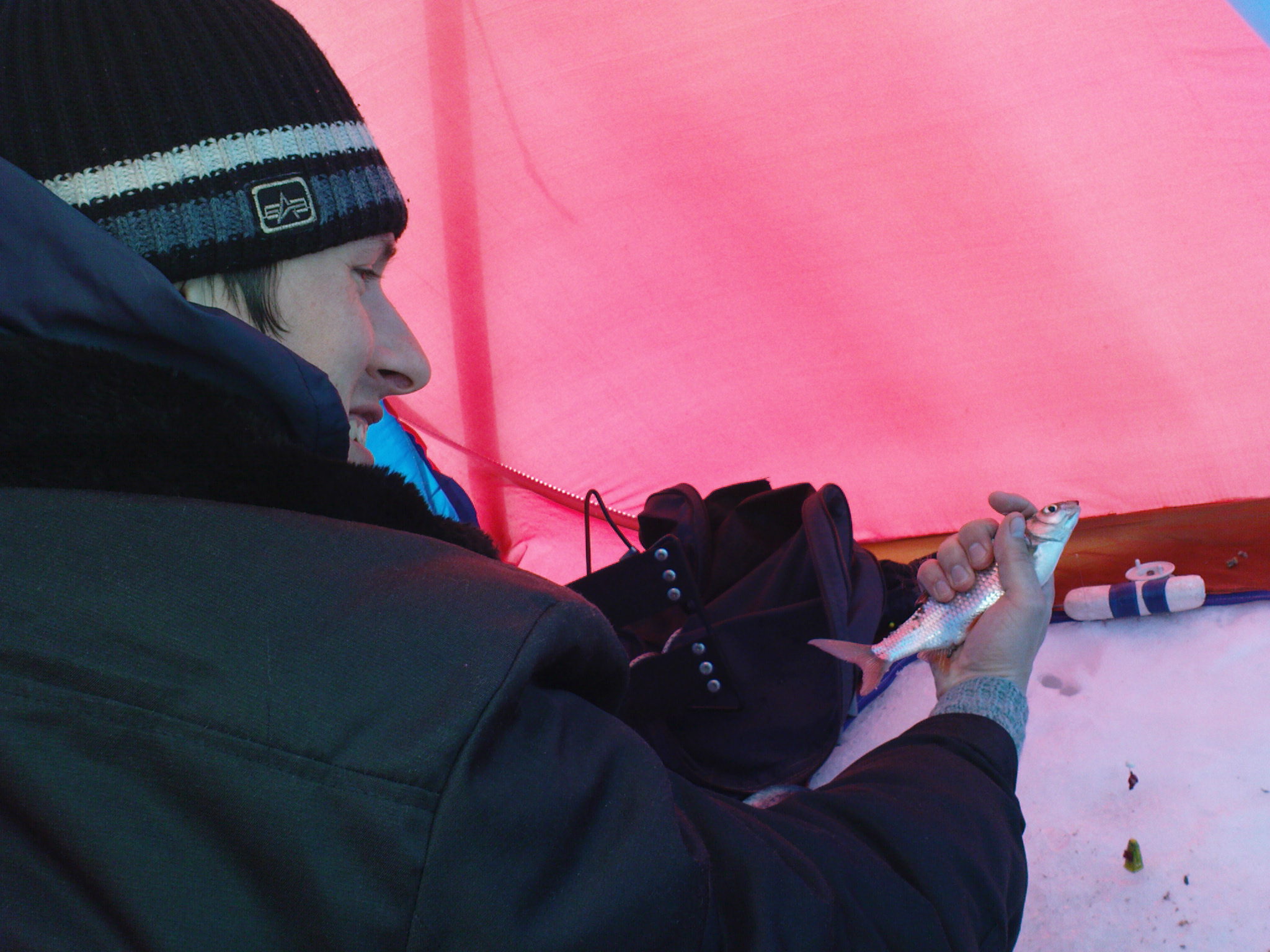Температура 0- минус 2, ветер западный около 6 м/с, солнышко. Шли 20 мин. Воду не скидывали. Ловили на вымя с красным мотылем. Улов около 2 кг мерной тарани.
