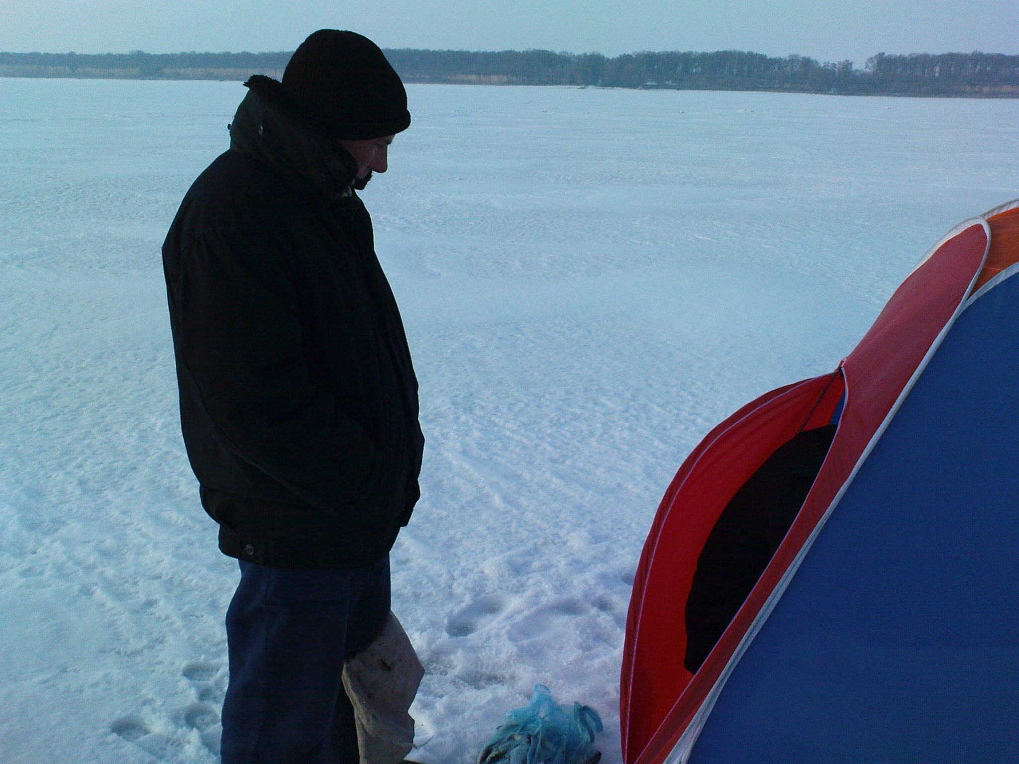 Вчера Недогарки,было выбрано решение экипажа из 4 человек,ехать именно в этот район.В 7 утра бурение лунок,подкармливание и бой.Расклевалась плотвичка около 9 часов,с утреца брала крупнее,потом кудато делась.Интенсива за целый день не было,да и лучше,можно было вылезти из палатки,прогуляться,размяться.В основном брала на красное вымя с мотыльком,на опарыш поймано шт.5-6 и то очень мелкая мормышка и крючки на удочке 3.5.Присоеденился к нам и Юра(гаврила),первый раз на море приехал,вроде бы и не отставал от нас,ловил.Погода отличная,неплохая рыбалка,да и сам поход в море,а шли 15 мин.не утомил,сделали заряд энергии на неделю вперед.В итоге 3.900 кг.плотвички.Ледок радует толщиной,думаю еще месяц поездим.