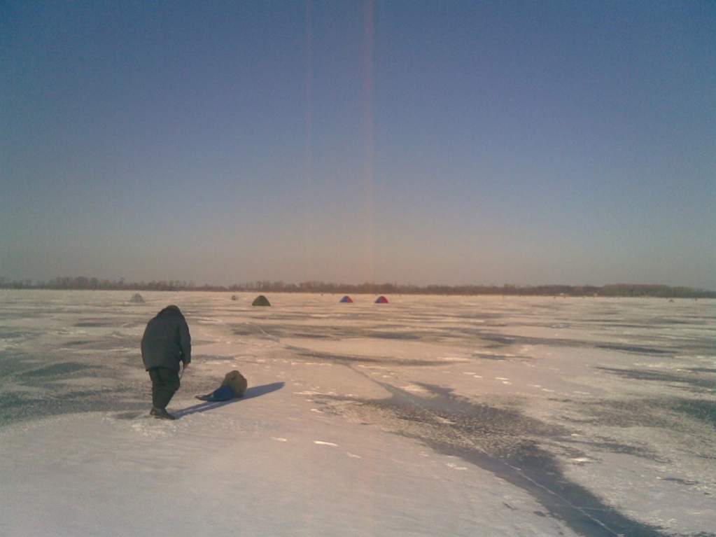отчет за 12.02.2011г.Недогарки.Приехали утром ,забурились возле столба в сторону с.Максимовка.Клевать не хотела вообще,было 2 поклевки холостые.Потом подьехал Жека(pol2901) с Олегом(korotia).Приглашали и меня пойти с ними в сторону Максимовки,но наша машина стояла в в.части,и потому я пошел ближе к машине.Там я и ловил до конца дня.Да тарань ловилась потихоньку и разных размеров.Палатку я не укрепил о чем потом немного пожалел.Как такого ветра не было и я решил на новом месте палатку не укреплять,но потом был резкий и неожиданный порыв ветра ,сижу в палатке инемогу ее удержать .в лунке оказались и приманка и рыба (сколько ее уплыло обратно подрастать до соревнований не знаю ).Ладно рыбка поймана ,воздухом подышал,удовольствия получил чего еще нада.