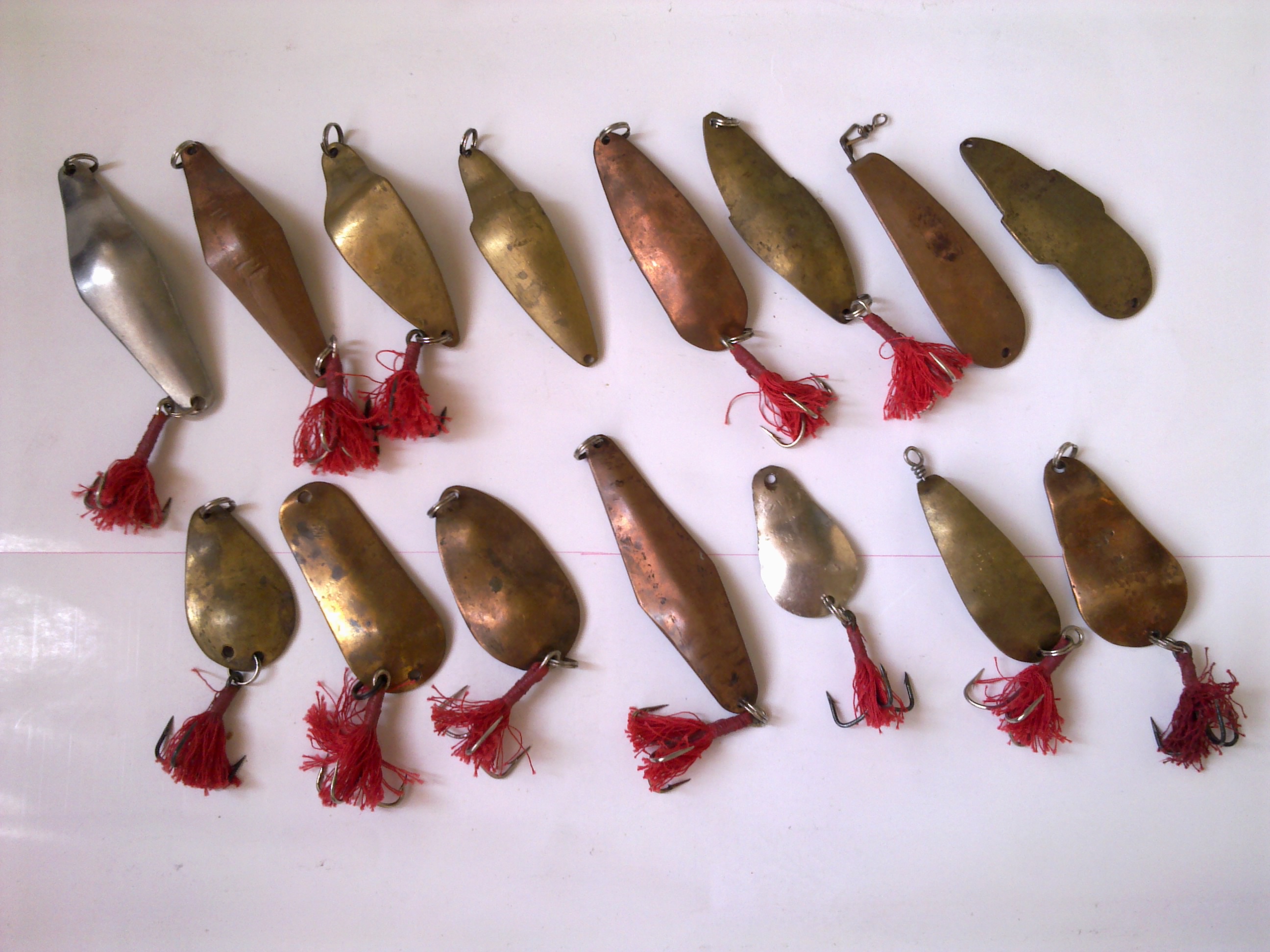 В ожидании осеннего периода, перебирал запасы, попались под руку... Все они сделаны моими руками давно, еще в детстве. Тогда во всех 3-х спортивных магазинах нашего города, полки рыболовных отделов были просто пустыми. Я везде где мог находил рыболовную литературу и перерисовывал оттуда уловистые блесны. Чертил по трафарету форму блесны на листе нержавейки, латуни, меди, обрубывал, обкусывал и обпиливал напильником. С помощью молотка, шариков от подшипников и тисков придавал изгиб, полировка, оснастка и вперед! Все разловлены! Часть утеряна. А сейчас воблеры-шмоблеры, мепсы и т.п., вот и валяются себе "уралки", "североуральские", "женевы", "шторлинги" и т.д.. :(