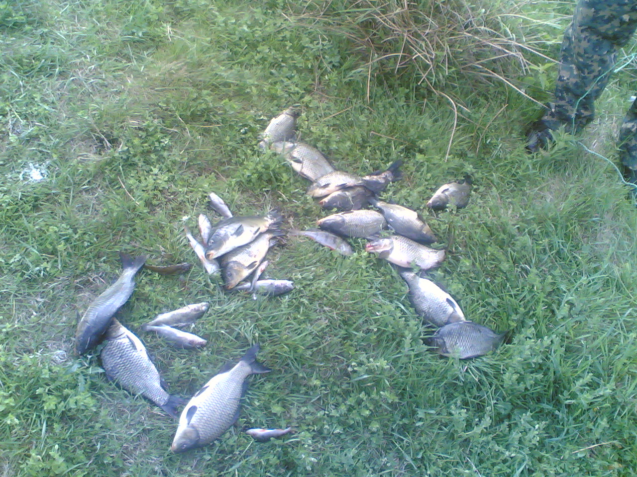 Около 10-00 видим как знакомый тянет карпа: уже с подсаком таким нормальным залез по пояс в воду, но как всегда, есть мелочь которая испортит все: оказывается на этой закидушке крючки к пластине привязаны были не петлей, а на узел, он то и развязался.