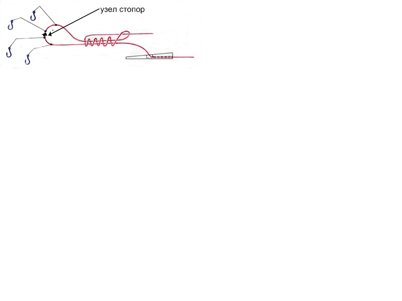 Перед завязыванием петли на леске вяжется узел, так что бы собственно узел оказался внутри петли - узел препятствует полному затягиванию петли при больших усилиях, например, при вываживании крупной рыбы или при зацепах. Узел вяжется между двумя поводками, что бы потянув за нужный поводок можно было растянуть затянувшуюся до минимального размера петлю.