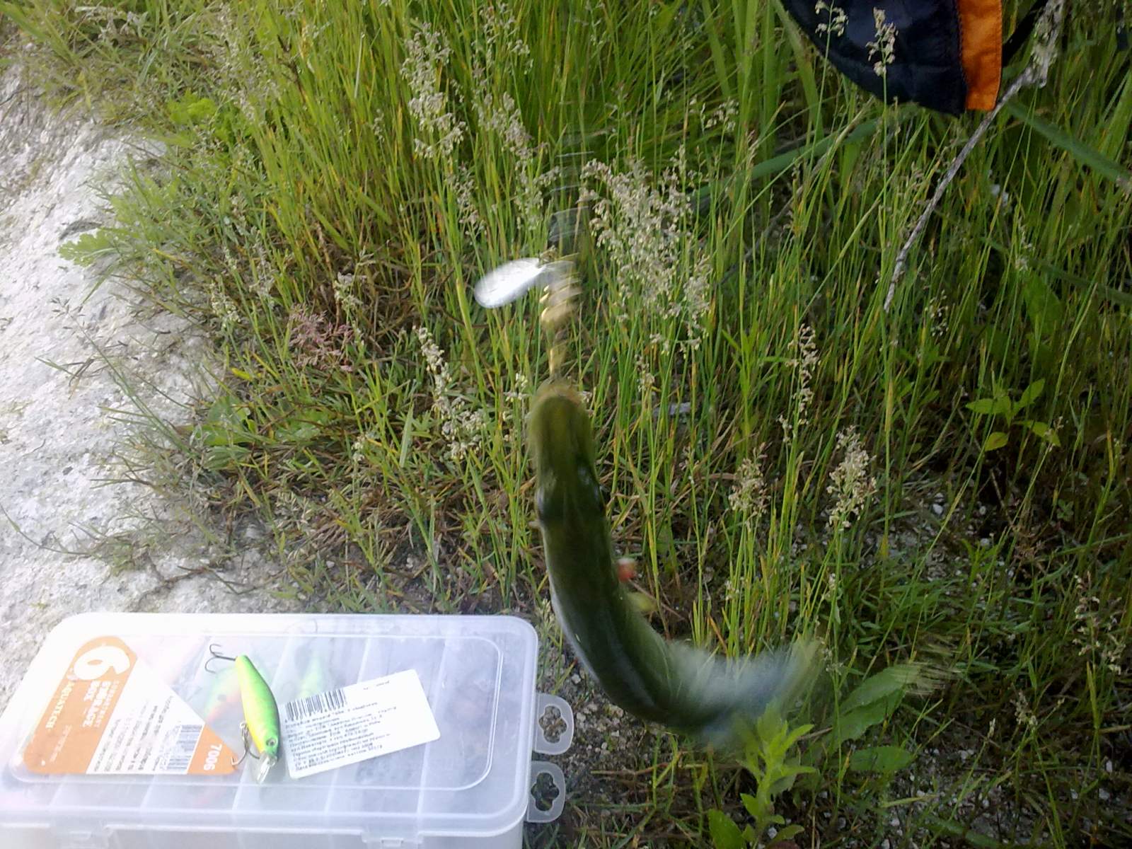 Далі для експеременту ставлю вертушку №2 зі смугастою наклейкою від Джаксона. Перший заброс, дві підмотки і удар... Хвилина боротьби і прикрий схід під берегом. Щучка не погана до 1,5 кг. теж пішла підростати, але без мого дозволу :) .