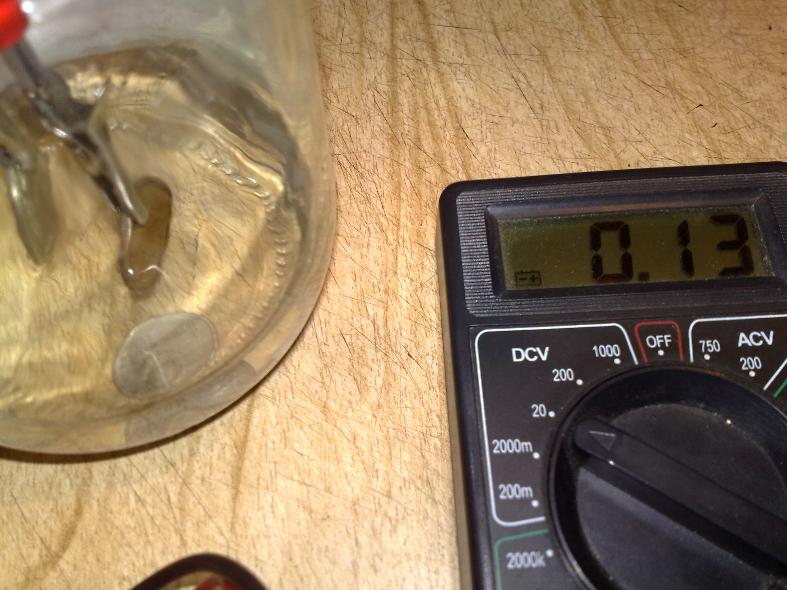 Еще фото. Следует отметить что контакт крокодила с монетой быстро окисляется, см фото №2 в предыдущем сообщении, а так же то что при размещении в банке доп монеты незначительно падает ЭДС