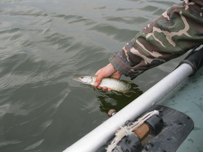 Не буду писати великий звіт:). Впіймали мало. Вся риба стоїть на глибині. На першому закиданні в мене була покльовка щуки, але проґавив я її. Брат кидає в те саме місце і витягає щуку на 1.5 кг. Потім глушняк повний. Кидали воблери, залізо - нуль. Тільки силікон. Отже, в мене було сім покльовок, з них реалізовано тільки одна (маленька щучка). У батька два окунці, та два сходи щуки. Хоча і похолоднішало, а народ все їздить і їздить на рибалку( народу було багатенько). До 12.00 всі активно пересувалися на човнах, а потім пороз’їжджалися. Біленька зовсім не відгукується на наживки. Хай щастить.
