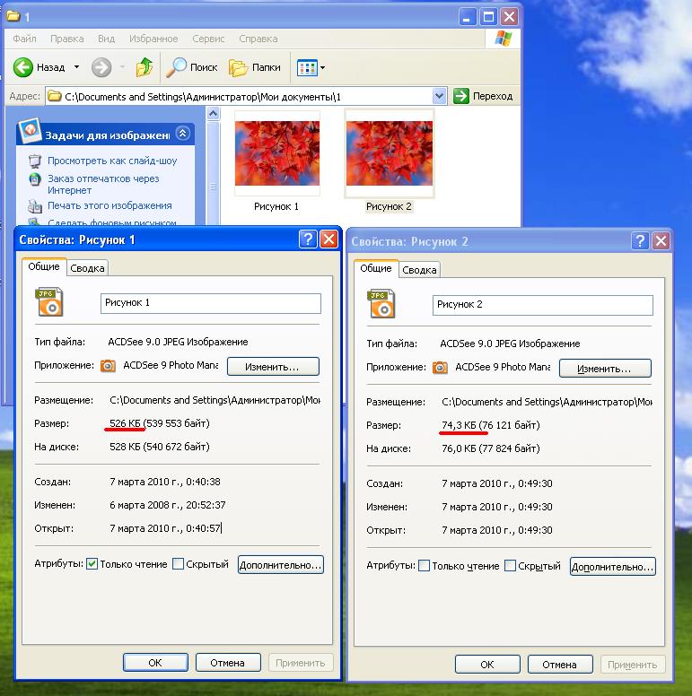 5.В итоге начальное разрешение файла с 1600х1200 уменьшилось вдвое до 800х600, а по размеру файл "похудел" практически в 7 раз.