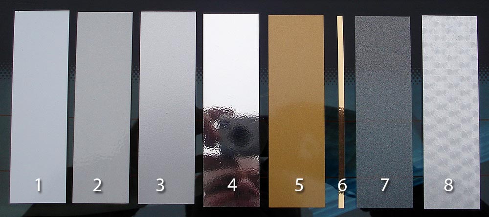 Вот некоторые пленки при обычном (пасмурном) освещении 1 - белая 2 - световозвращающая 3 - серебро матовое 4 - серебро зеркальное 5 - золото матовое 6 - золото зеркальное 7 - эффект пескоструйной обработки (матовое стекло) 8 - металлик "чешуйчатая" На примере ОКР показана голографическая пленка и световозвращающая Голографическая отливает радугой на солнце Световозвращающая возвращает свет (в данном случае от вспышки) обратно к источнику света. Типа как дорожные знаки.