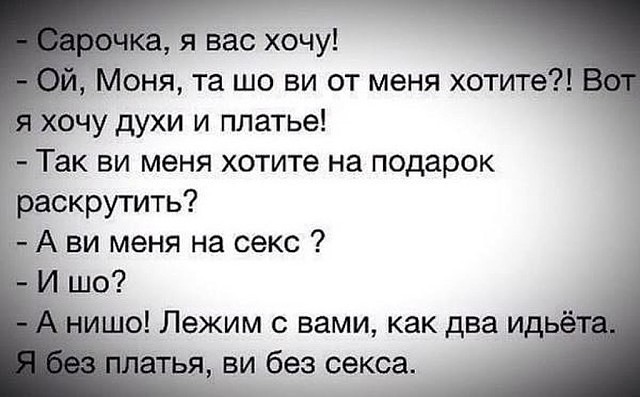 Сидят два рыбака, рыбачат. Подходит грузин. — Я тут такой риба видэл, страшний такой. — Щука, наверное. — Нэт, нэ щюпал. Зэленый такой весь. — Дык, окунь наверное. — Нэт, нэ боком. Прямо пошел . — Дык, сазан, наверное. — Ничего не сказал, только квакнул два раза и в тина ушел.