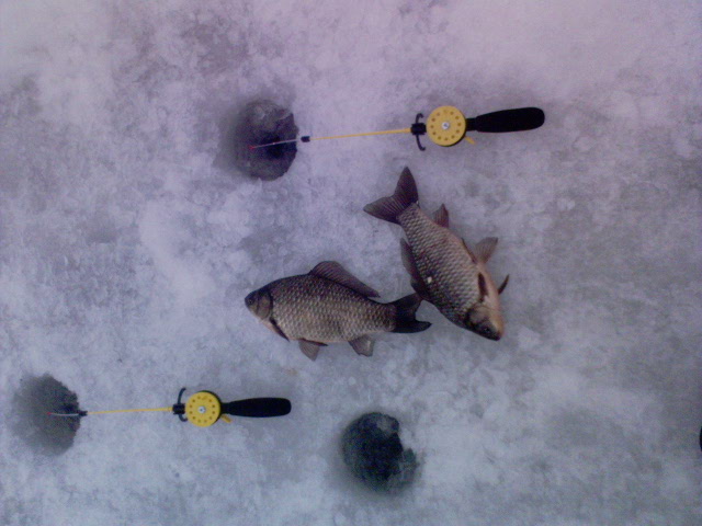 Виїхали з братом з ночі, так що на ставку були ще за темна. Дочекавшись світанку пішли вишукувати ямки (рибалка там специфічна: карась і карп стоять в невеликих ямках метр діаметром), знайшов за 10 хв. Виставив першу вудку і відразу покачування кивка, витримав паузу з 2 хв і перший впевнений підйом кивка, підсічка і карась 450г на льоду. Швидко перезаряжаю і опускаю насадку і відразу ж підйом, підсічка і ще один красень 500г на льоду. В голові промайнула думка, що сьогодні буде ВДАЛА РИБАЛКА:wo_kakaya:, але... :pЗа наступні 6 год пошуку риби жодної покльовки я та ін риболови не бачили.