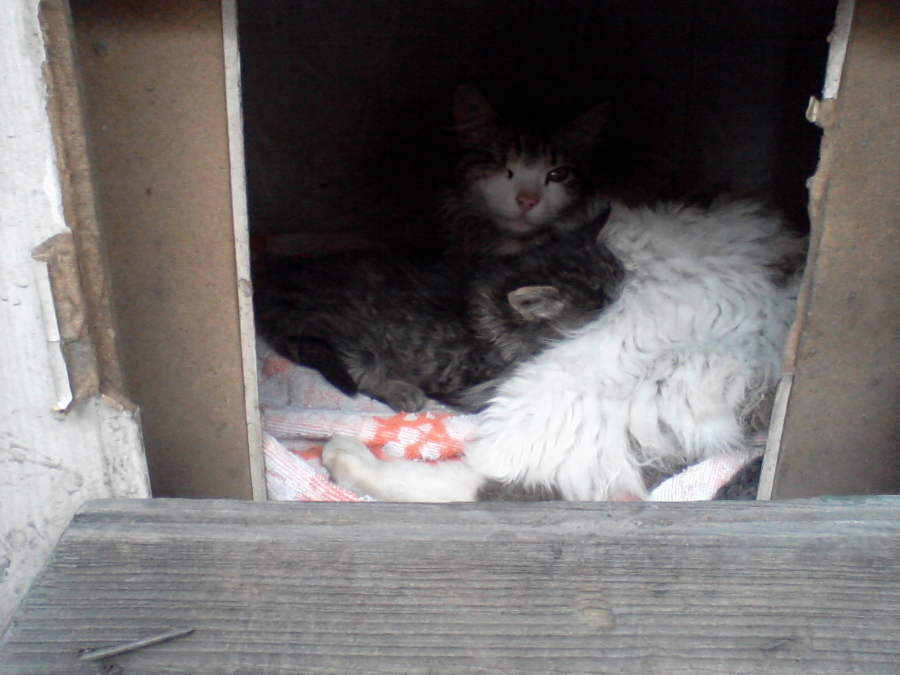 От это-ж... взял малую, даже кличку ещё не придумали, а своих от Машки отправил в подводники. Ну притулили до неё, непонятно... два дня ночевали они в летней кухне. Утром рано открывал, они на улице побегают, поедят, а на день, пока все на работе, опять в летнюю кухню. Вечером спроцедура повторяется.