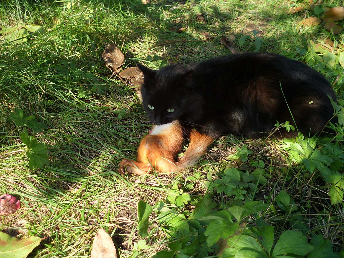Приехал домой с рыбалки, а кошка Жучка, видать на охоте побывала. Жалко до слез белочку, а что поделаешь, хищный зверь, и ругать бесполезно.