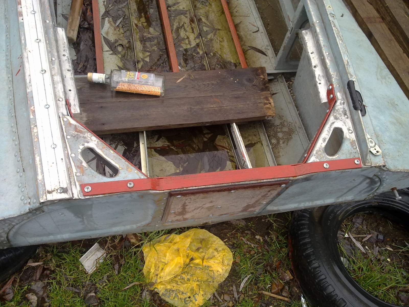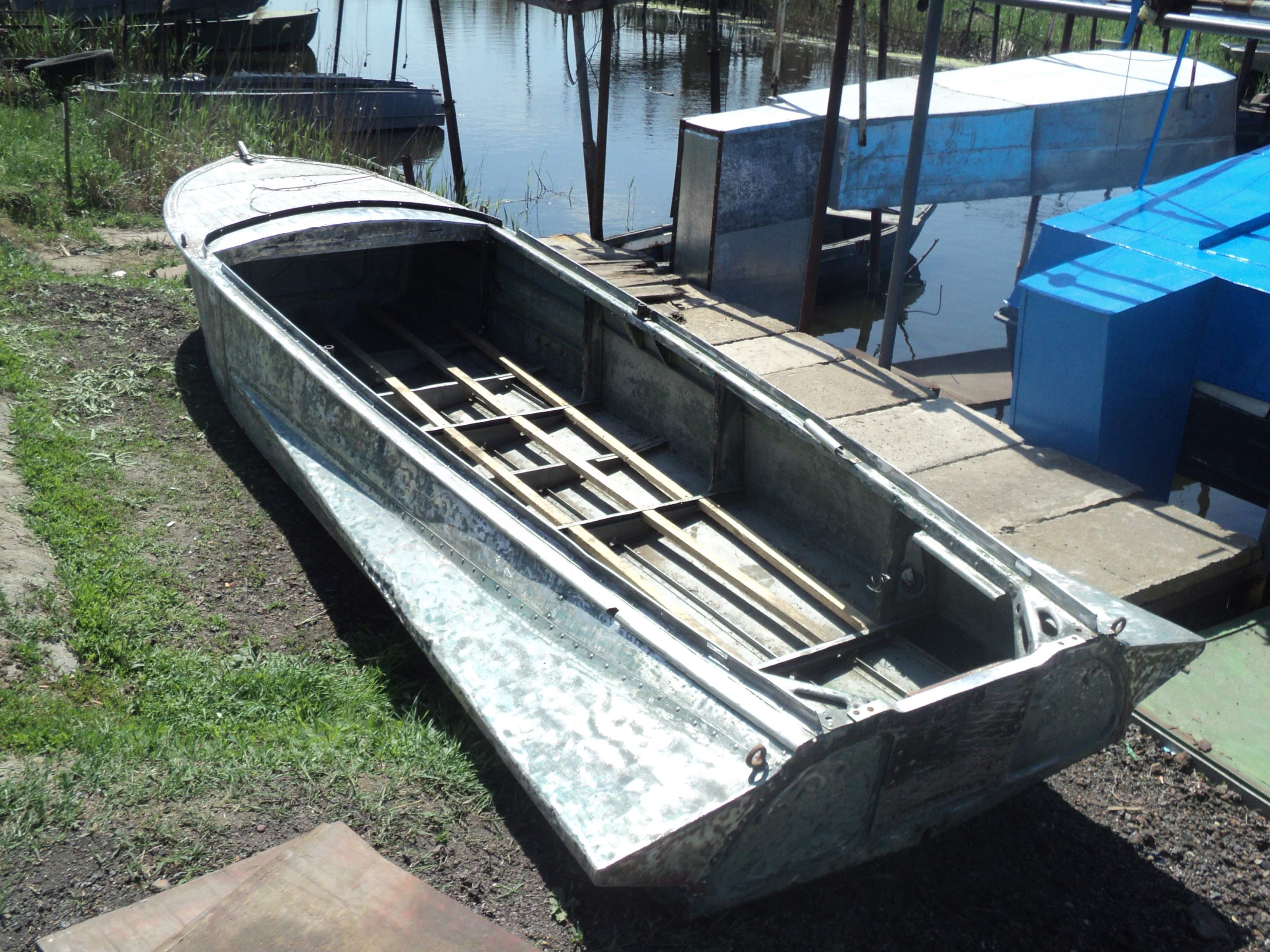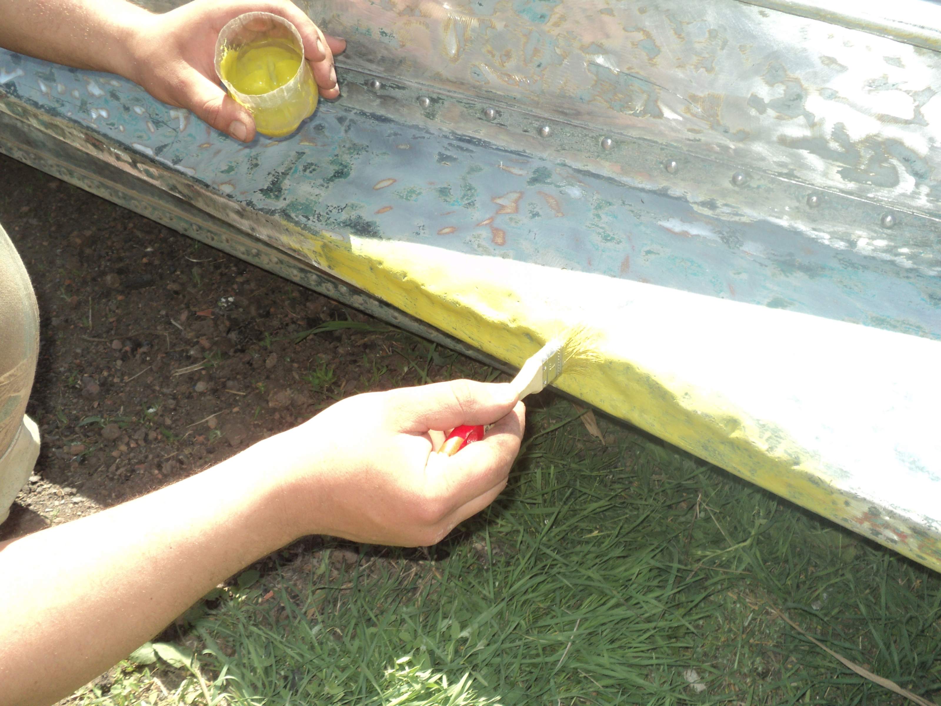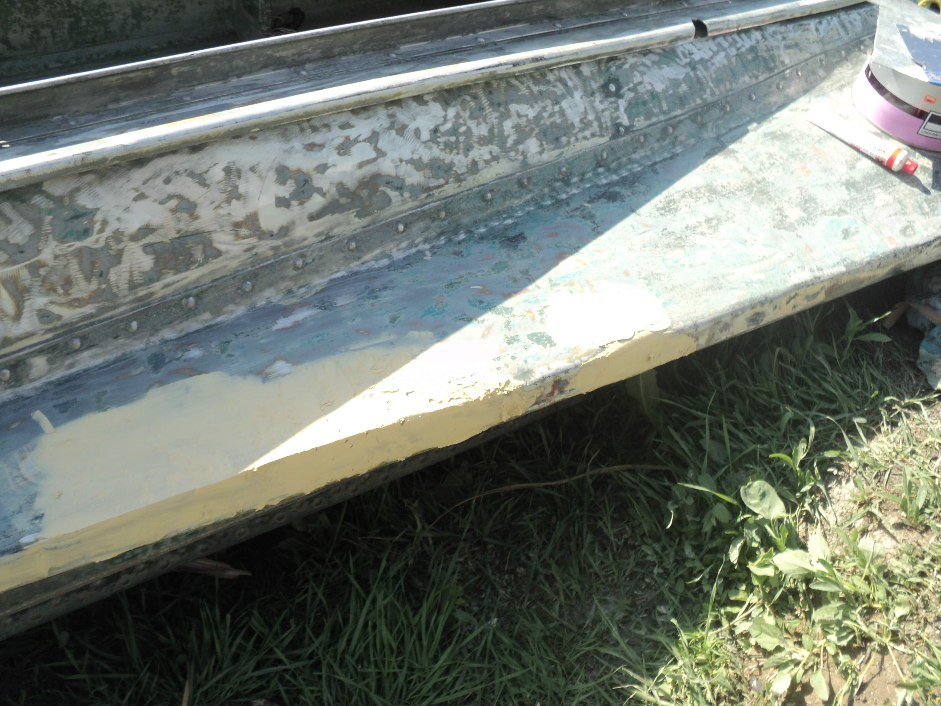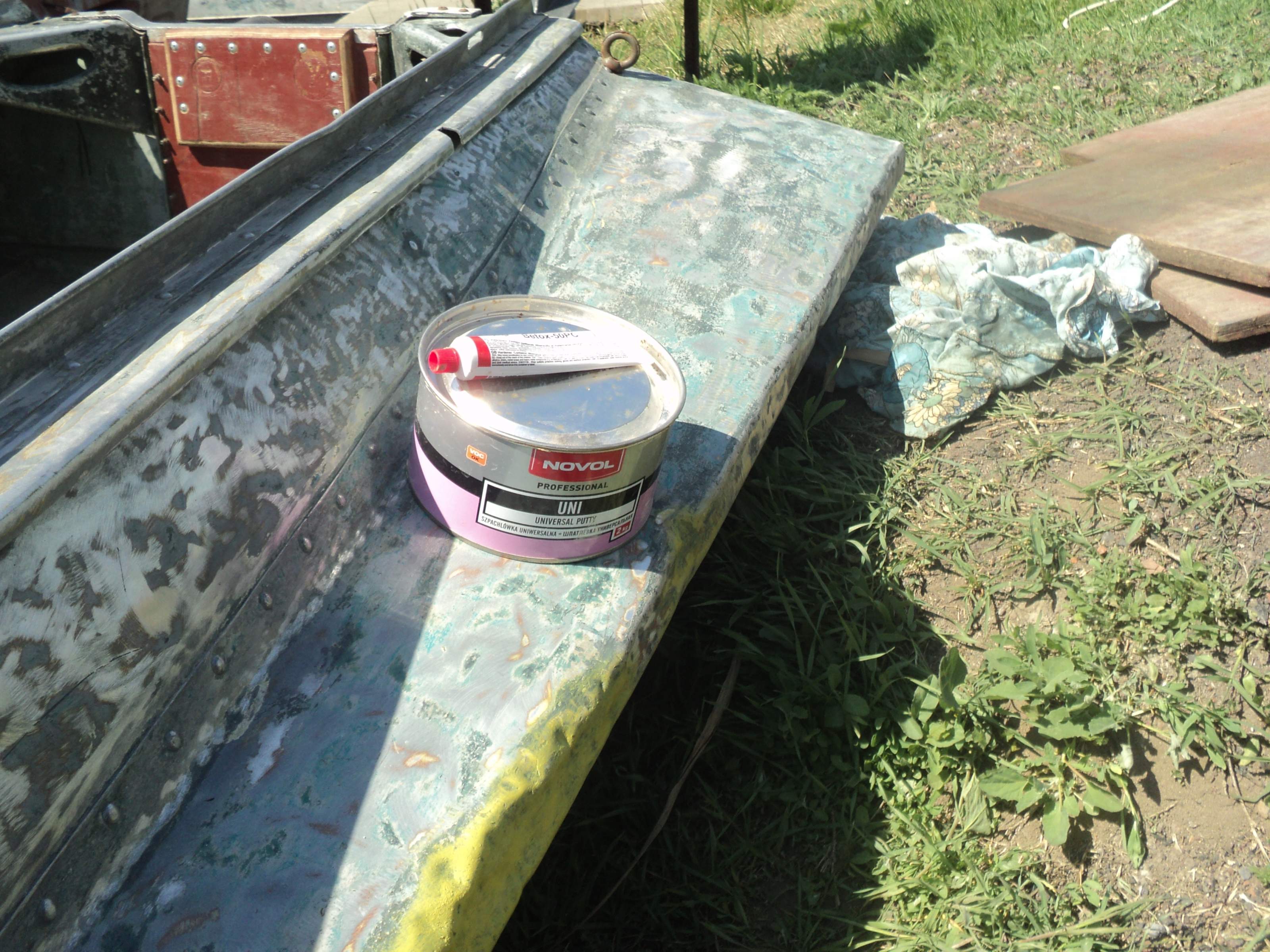 Зря Вы ее щетками обдирали, теперь окислятся начнет, ведь это дюраль а не люминь. И еще, автошпатлевка не очень подходит, особенно когда слой толще 2 мм, нужно было эпоксидку с алюминиевой пудрой смешать, вот тогда хоть в "пол кирпича" наносится, а эта штука может отвалится от вибраций. А вообще лодка зачетная, я на такой когда-то пару раз в волну нырнул, так прикольно кубарем лететь с кормы в нос. Какой ДВС вешаете?