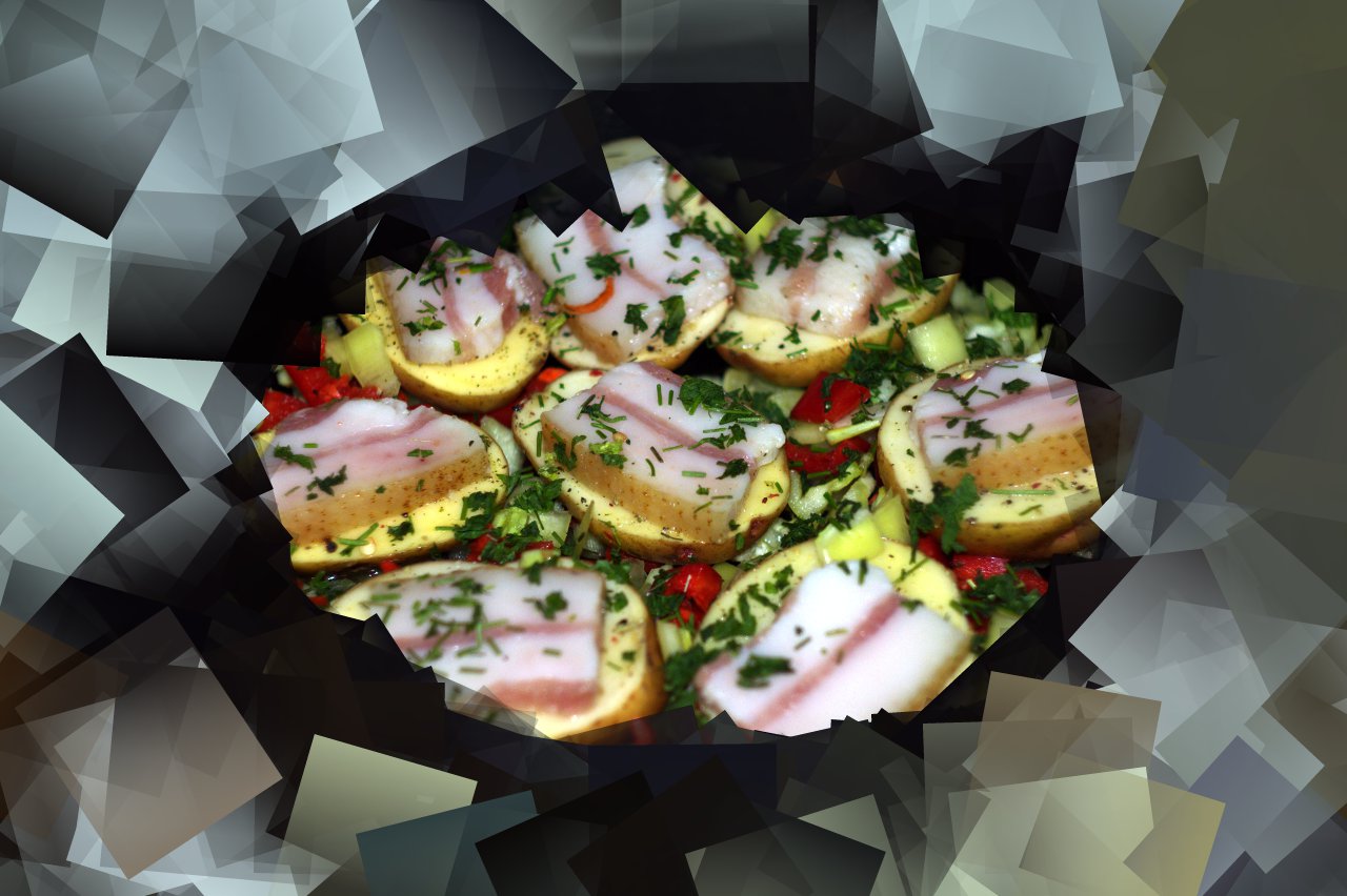 Дуже смачне блюдо. Я ше в середині картоплини роблю невелику ямку куди ложу кусочок сала і цибулі. Тоді сік від сала і цибулі не розбігається по картоплі а пропітує картоплю.