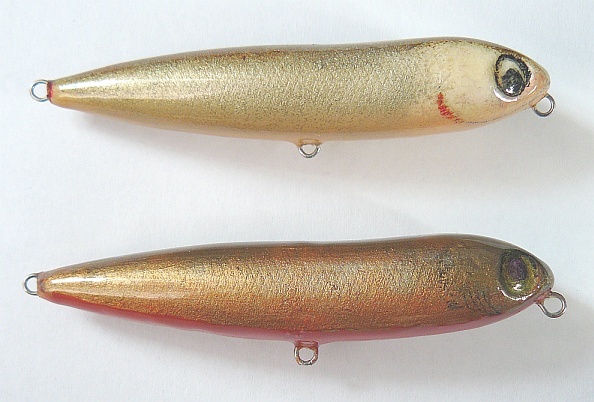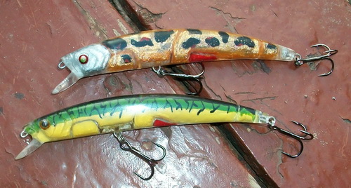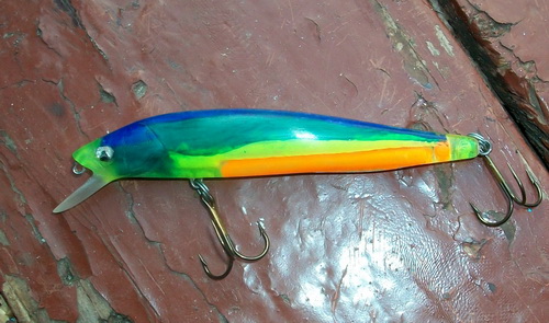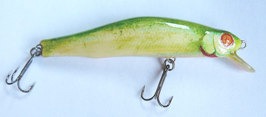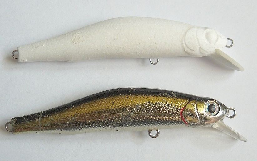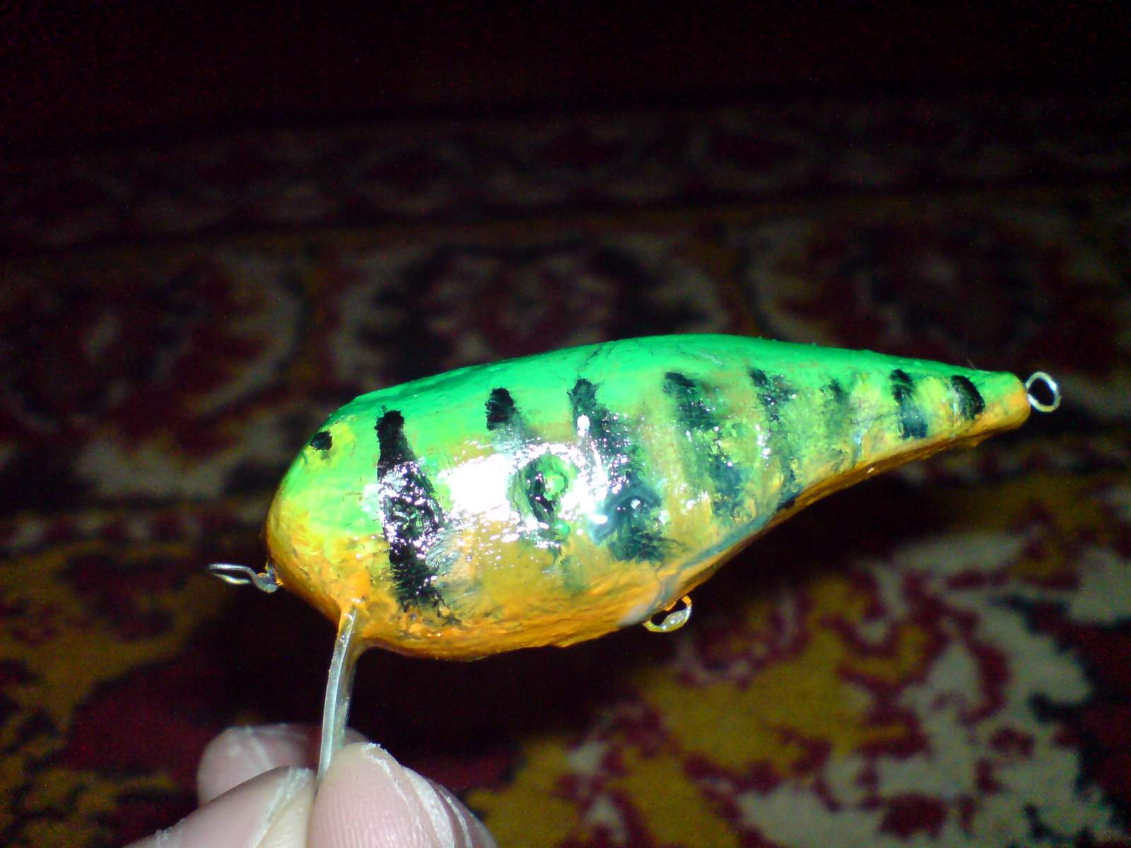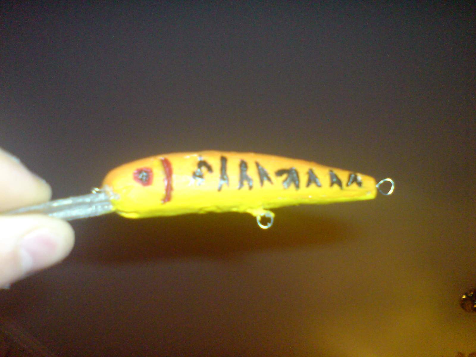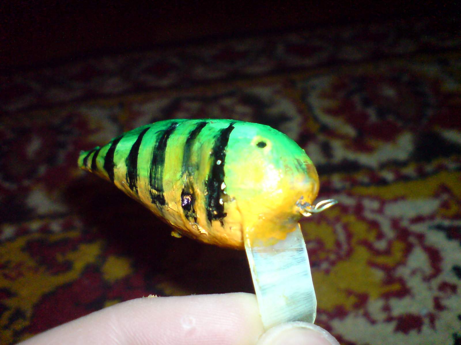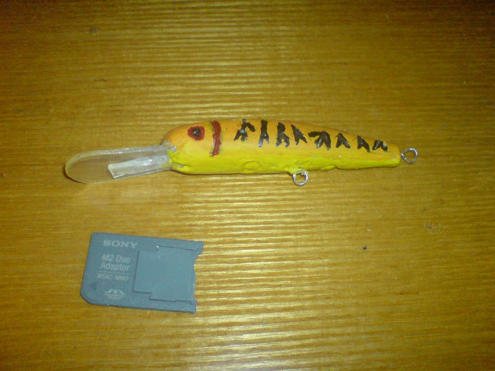 У меня мой первій очень похож на третий, только цвет был под натурал. Просто хотелось сделать несколько советов. На первом фото у воба нужно обрезать лопату над пальцем, будет лучше. На ф3 нижнюю петельку нужно поставить где-то посредине, между вашей петелькой и носом воба, тройники не будут сцепляться, да и отгрузку лучше делать в том же месте. И больше нужно почитать о том как сделать воблер. Будет жалко затраченного труда, если сделанный воб не будет работать. Читайте, пробуйте и все получиться. Для начала почитай здесь http://www.vlasenko.ru/Vobler/Vob2-txt.htm