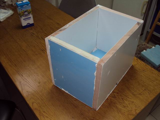 Вот друзья на последней рыбалке,наловили окуней красавцов 300-500гр.Домой не довезли, всего-то 145км.На улице было 35 градусов.Улов просто закопали.Возникла идея смастерить холодильник,благо фляжки как на фото с жидкостью продаются в супермаркетах(цена 10-15грн за штуку).Каркас изготовил из стеродура,обклеенного пластиком.На фото заготовка,позже после испытаний опишу более подробно сколько держит холод, и его вместительность:D