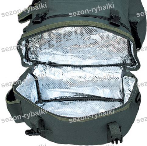 Верхнее отделение для вещей - 20 л. Нижнее отстегивающееся термоизоляционное отделение для продуктов - 10 л. Наплечный регулируемый ремень - для самостоятельной переноски термоизоляционного отделения. Боковой наружный проветриваемый карман. Задний карман для документов. Карман с креплениями, для транспортировки телескопических удочек.
