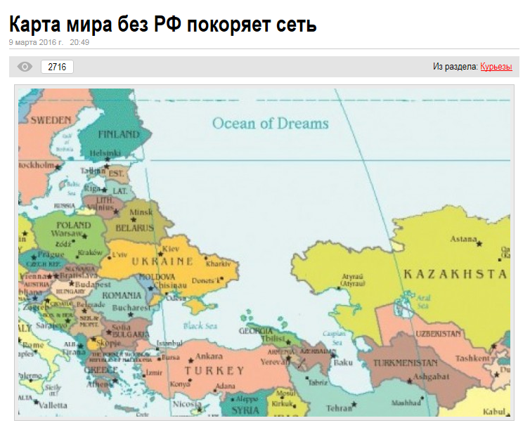 http://newsyou.info/karta-mira-bez-rf-pokoryaet-set В Сети получила вирусную популярность карта мира, на которой вообще нет Российской Федерации. С этого места исчезла не только страна, но и суша. Как указано в описании, эту карту сделали и напечатали в Грузии, обозначив данную местность, как «океан мечты». Что же, многие пользователи Сети пишут в комментариях, что очень даже не против жить на берегу такого положительного океана, который наверняка никогда не введет свои войска, не опрокинет зеленых человечков, не станет бомбить мирные города, перекрывать газ и срывать мирные договоренности.