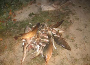 У задержанных браконьеров обнаружено и изъято убитую ими рыбу в количестве 114 штук, общим весом 5 кг: судак - 2 шт., Сазан - 2 шт., Щука - 7 шт., Сом - 1 шт., Толстолобик - 1 шт., Голавль - 1 шт., рыбец - 1 шт., карась - 5 шт., окунь - 4 шт., плотва - 26 шт. и верховодка - 64 шт.
