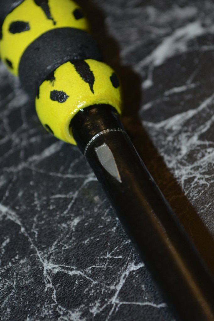 Сделал самому младшему палочку. Дизайн чисто пацанячий. Сейчас это ивовый прутик с засевшим на нем любимым персонажем Minuscule (Букашки). Рукоятку делал мощной, ввиду рисков поломки, и на перспективу, поскольку в будущем, это станет световым мечом Джедая. Неоновое покрытие бланка уже приготовил)).