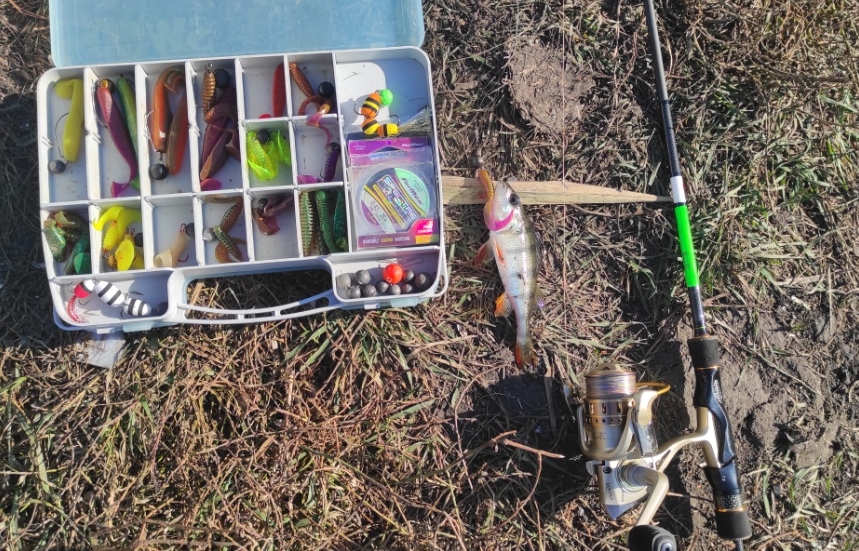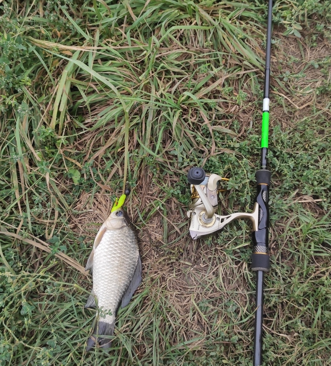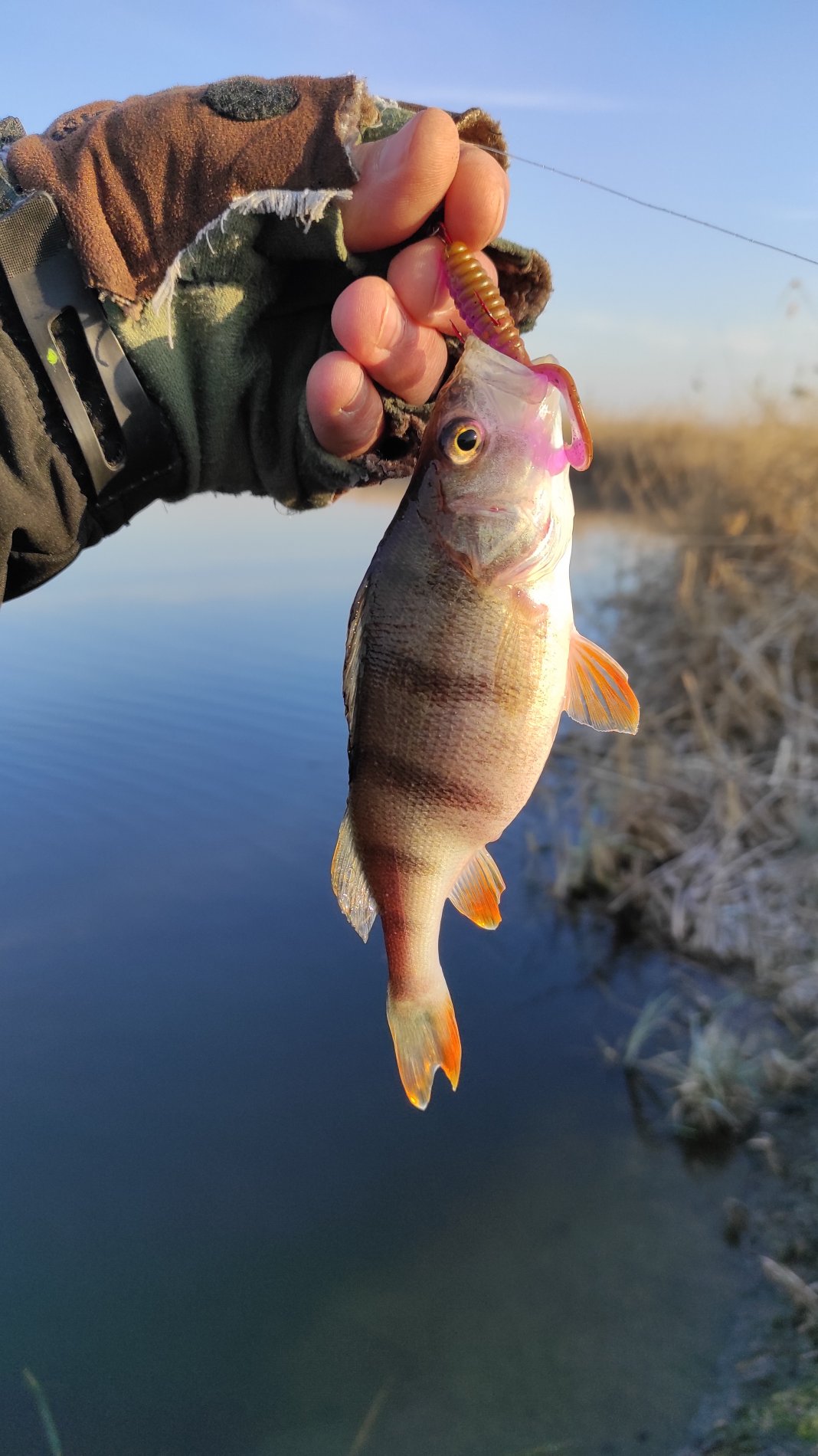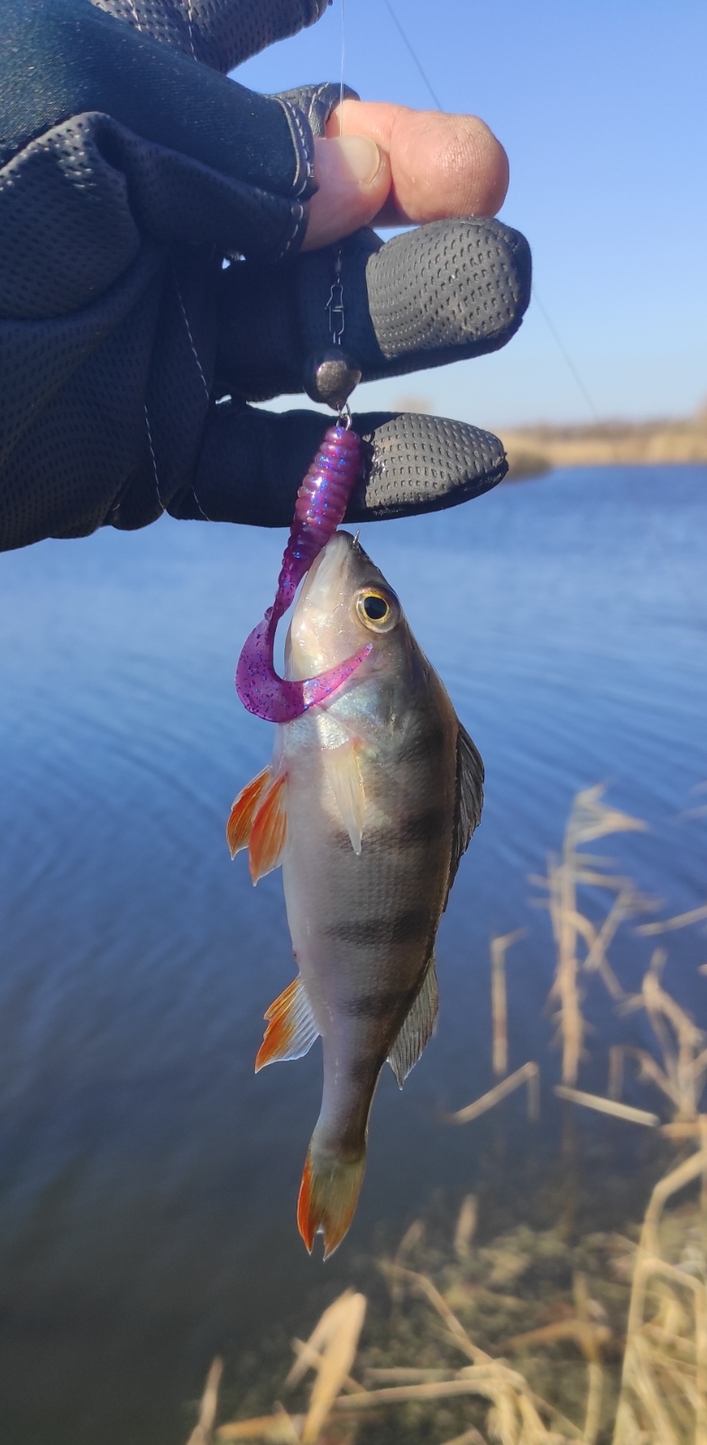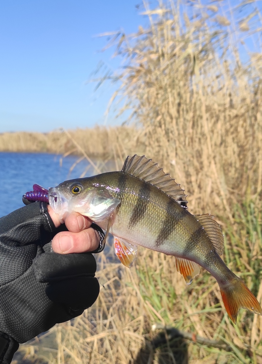 За первый час перепробовал, все цвета твистеров, на ядовито жёлтый заработал два невнятных тычка, и через ещё час поклёвка, хищный карась на берегу, взял в пасть. После фотосессии отпущен восвояси.