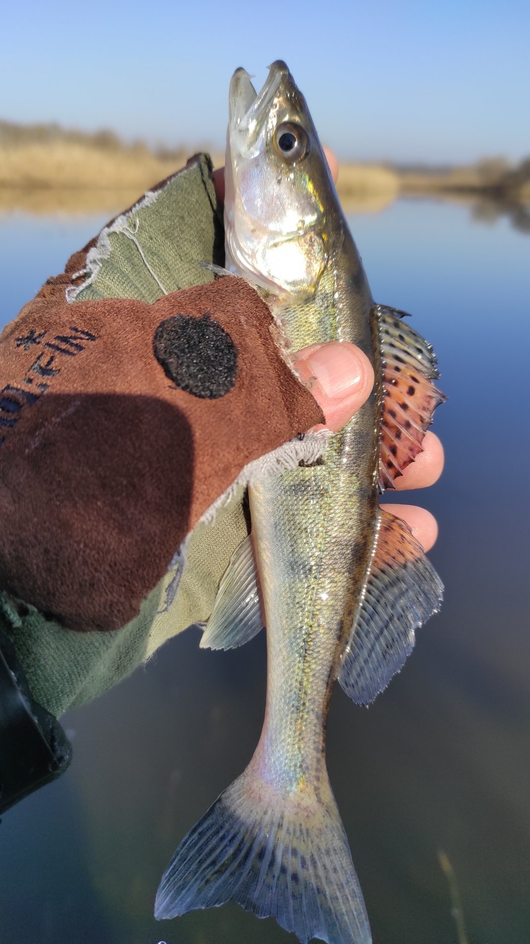 В 5.30 температура -5, а выезжал из города в 4.30, было +2, кольца обмерзают, но рыбу ловить надо. Первые поклёвки начались, когда пригрело солнышко и закончились когда задул ветер. Ударов было до десятка, два схода и пойман окунь и два судака. Один под кило, второй грам на 100. Мелочь ушла к папе с мамой.