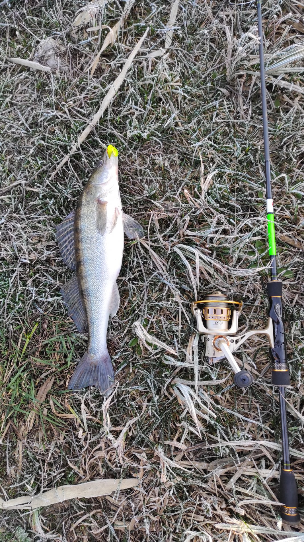Ещё было пяток поклёвок, поймано два судака грамм на 500 и 50, ушли к папе с мамой, подростать.