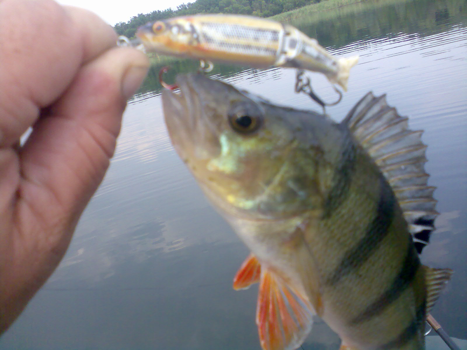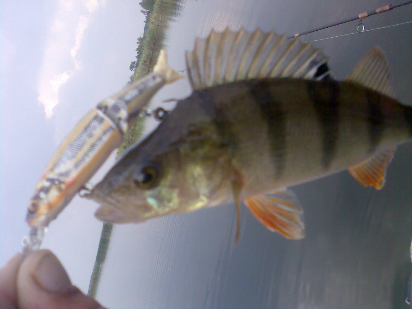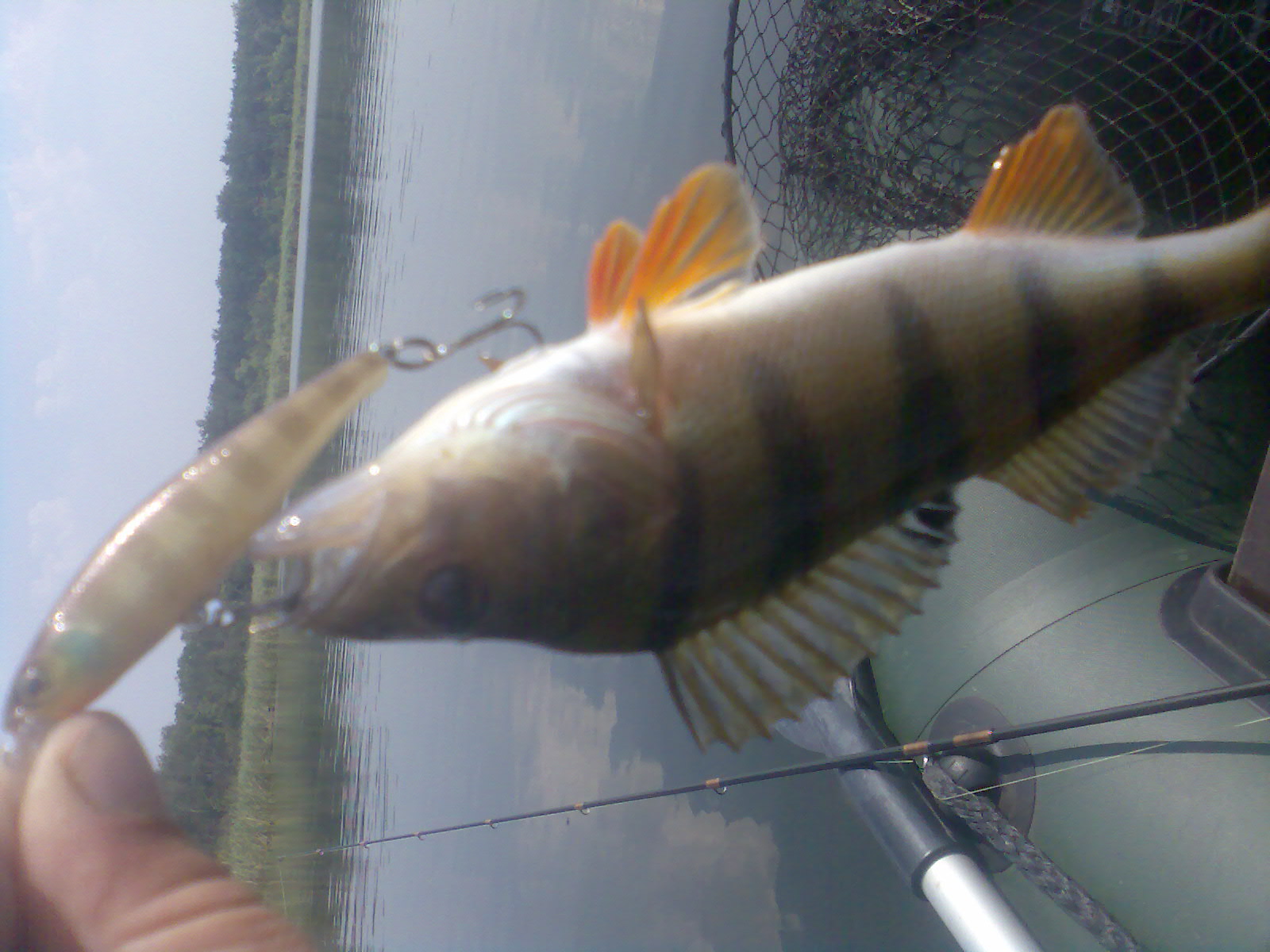 Было принято решение двигаться на чистую воду где глубина была около 2х метров.Ипочти сразу нвчались поклевки окуней,которые стучали по воблерам и дружно сопровождали их до лодки но очень редко засекались.Примечательно то что уменьшение размера воблера дало отрицательный результат,даже выходы прекращались.