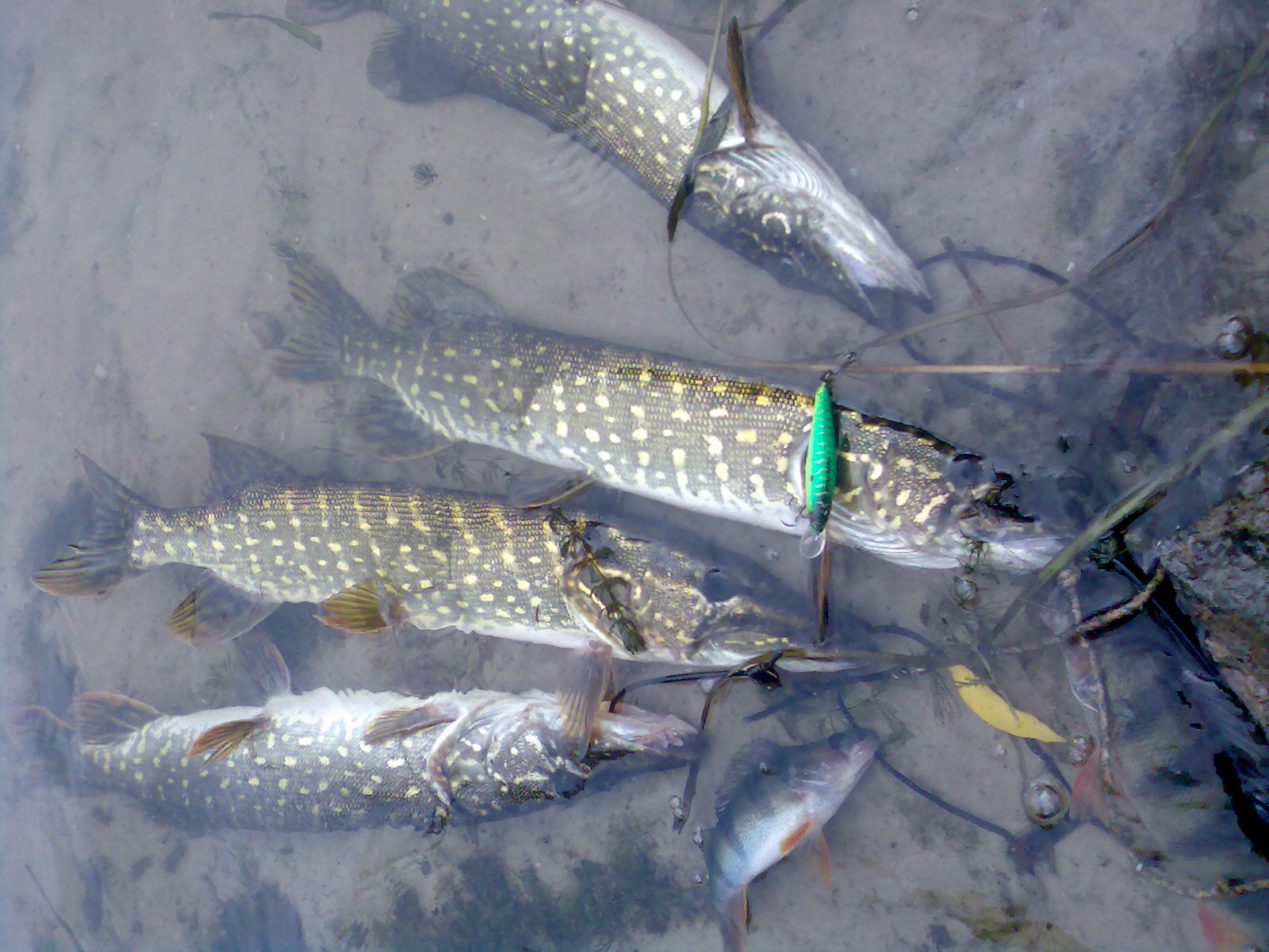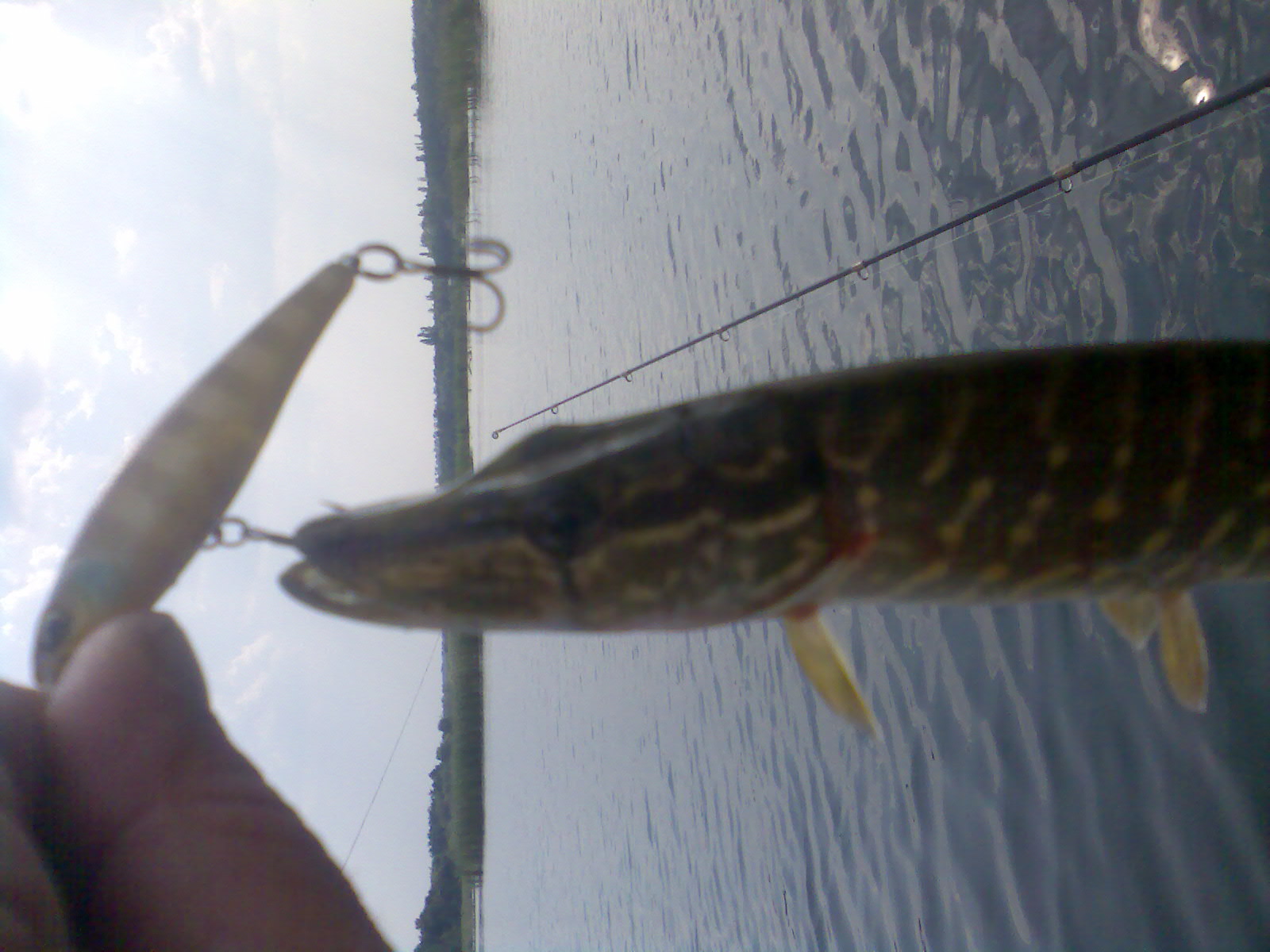 Сегодня снова посетил водоем, правда погода не очень сопутствовала если б не ветер 5-6мс то настоящая щучья погода. В 6.00 на воде первый заброс сразу подцепил чью то сеть, (как потом оказалось что сетей наловил больше чем щук аж 6!!! что мог порвал. Такого б..ва еще не видел на этом водоеме).Плюнув на все погреб аж за мост к дачам, вообщем щука была активной в течении часа с 9 до 10 заработал 8 ударчиков 5 реализовал, + 5 мелко окуней, упирался в воблера но результата ни какого, работало только железо, мелкая щука брала жадно, по самые гланды, крупная за краешек. В целом рыбалкой остался доволен вот только браконьерство сильно огорчило...