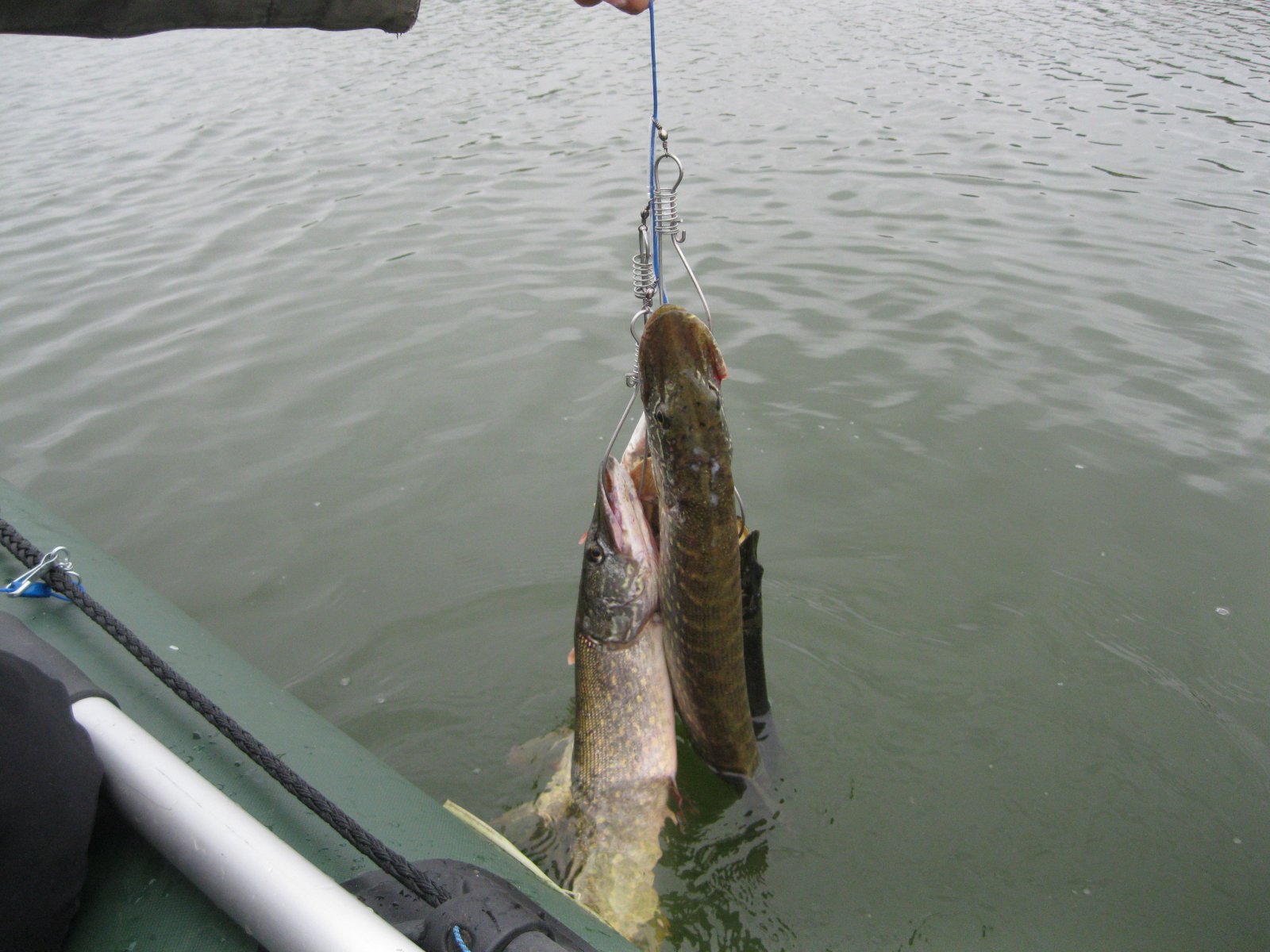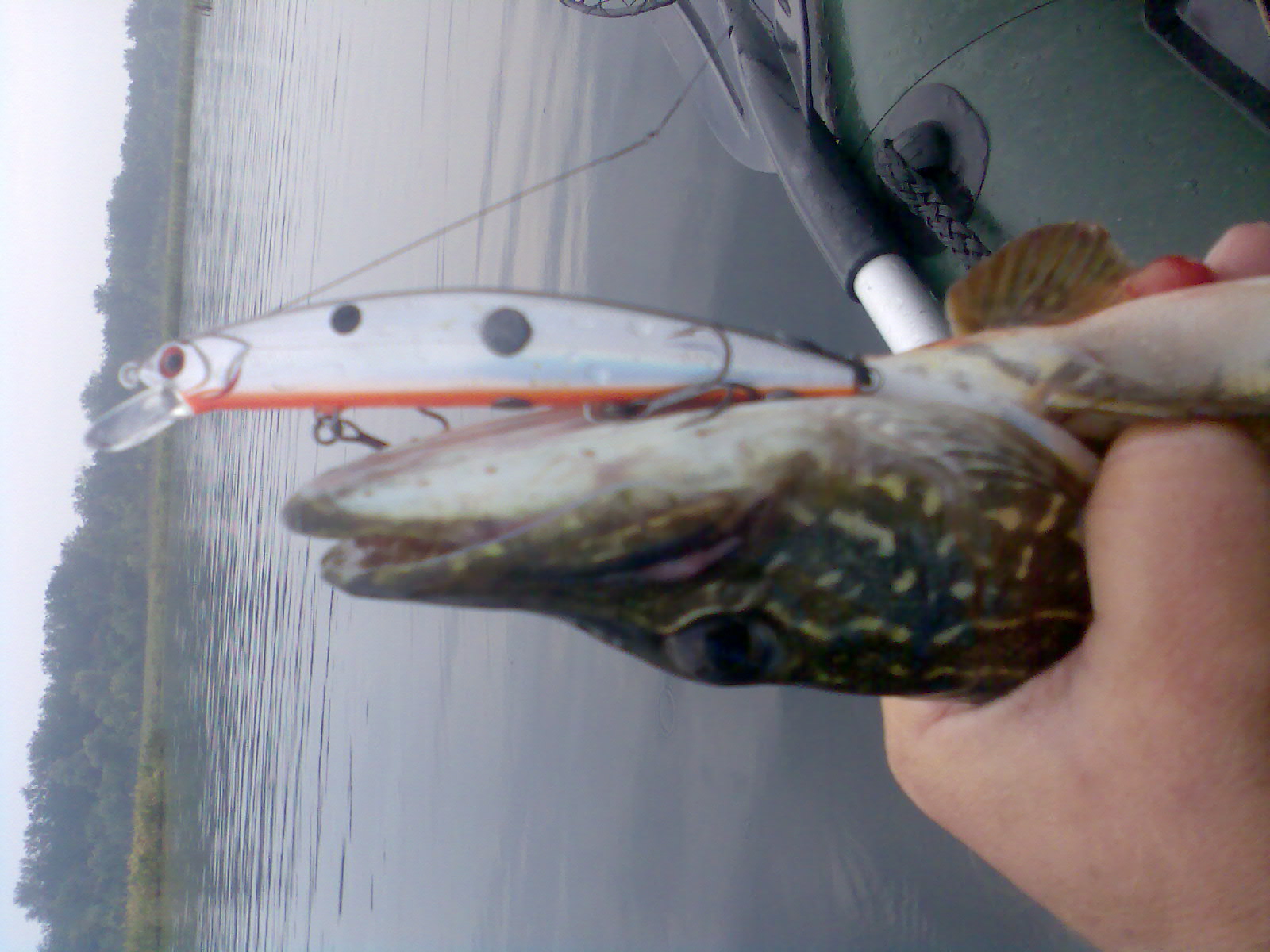 Сегодня с утра решил пособлазнять Тайваньскую щупакабру воблерами.По приезду на водоем сразу начался дождь и я долго не мог решиться что делать,выходить на воду или разворачиваться,но желание позаниматься смыкингом победило и надев дождевик начал накачивать лодку.Несмотря на непогоду выдвинулся в плавни и на первом якоре беру первую щуку но дальнейший облов этого места результатов не принес и я сменил место.И опять поклевка,визг ослабленного на первой щуке фрикциона ищука в лодке,Косадака Флэш 110 работает но для того что-бы его подгрузить хотябы до медленно всплывающего пришлось наклеить на него почти всю пачку липучек .Дальнейшая ловля на этом месте приносит только пару мелких прищепок,надо опять смещаться.Сменив пару мест все-таки нахожу активную щуку,даже две,здесь сработал Косадака Мета 65 кислотной расцветки.Дождь закончился а с ним и клев,правда мелкощучка ловилась и дальше.