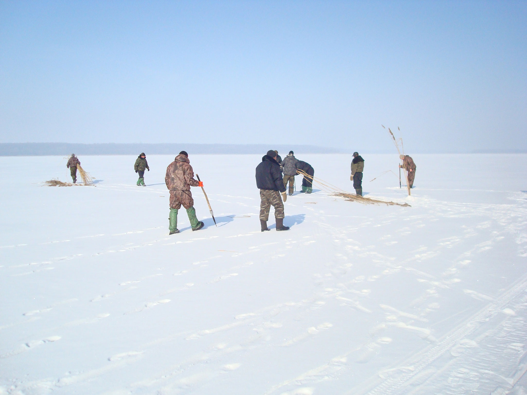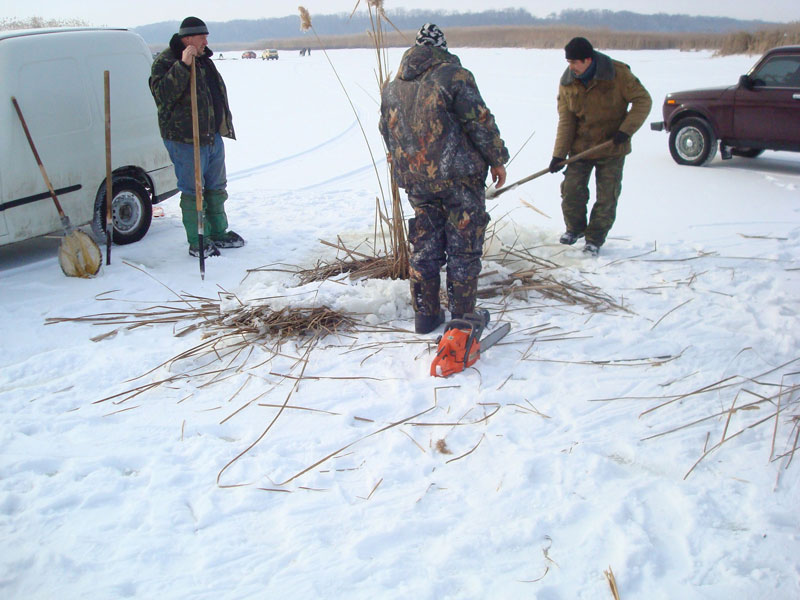 Чтобы хоть как-то помочь оставшейся в живых в этих маленьких озерцах рыбе всем рыболовным миром вышли на лед. Сверлят лунки, рубят проруби... Не говорят, а делают! На льду вставляют очерет в ополонки рука об руку и промысловики, и рыболовы любители, и сотрудники рыбоохраны, и жители прибрежных сел, которым не безразлична судьба водоемов.