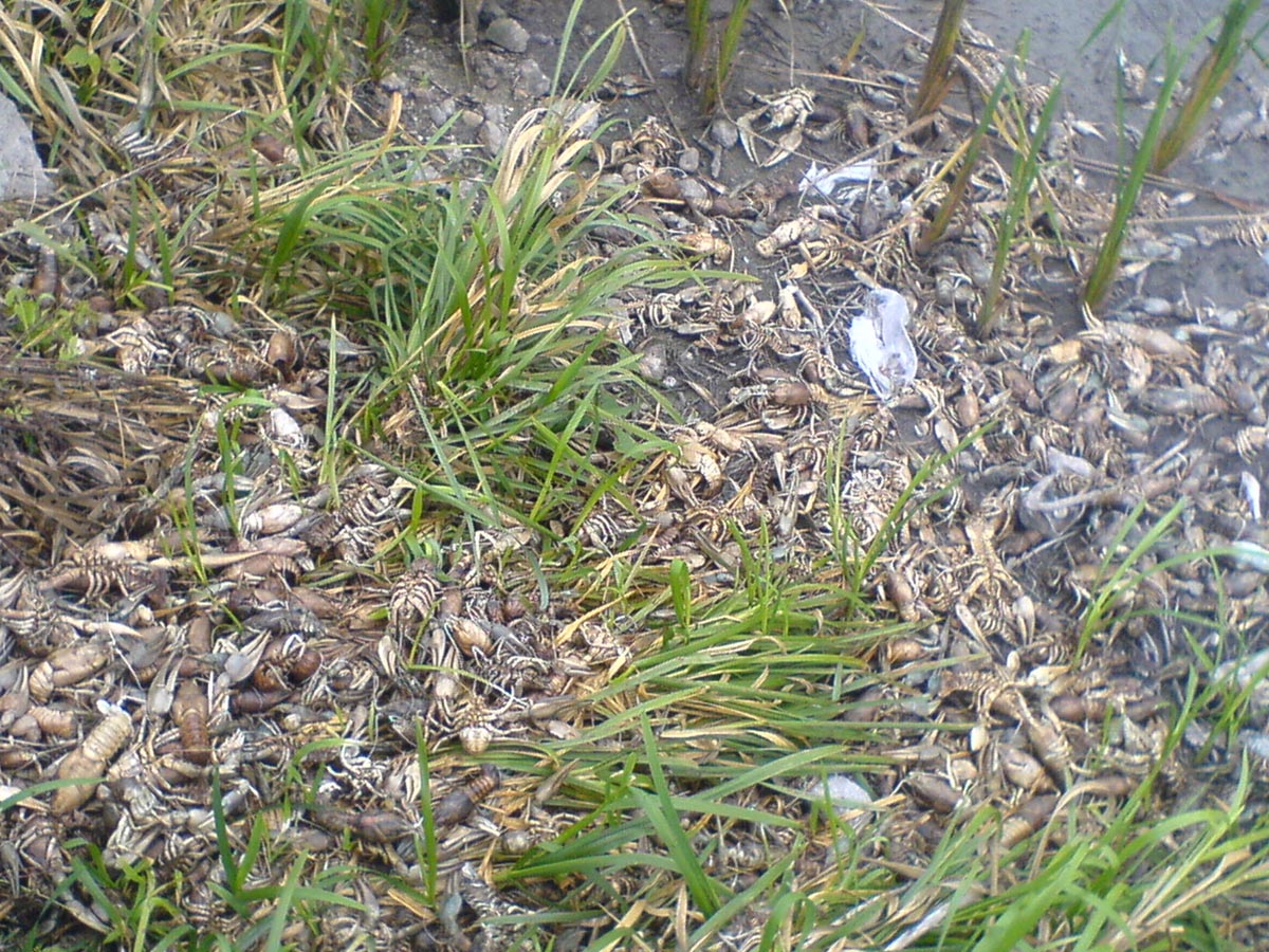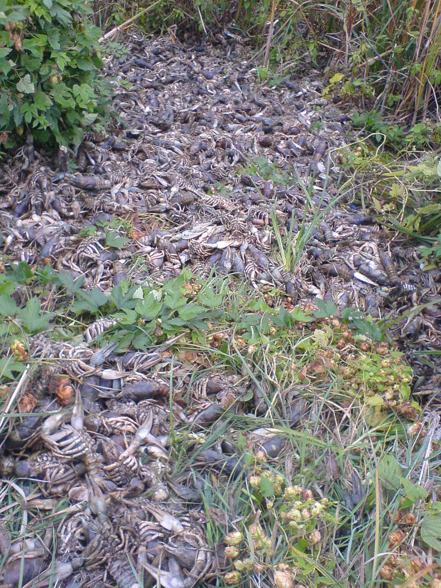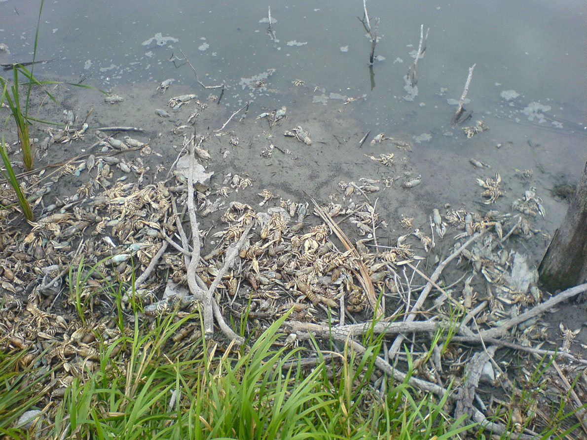 Нашёл вероятные концы этой истории (вернее истоки). В округе есть фирма которая занимается рыбной продукцией, в т. ч. и оптово импортироваными раками. Раки даже если ещё не сдохли, но уже не проявляют должной двигательной активности в продажу не допускаются. Видать, чтобы не везти нетоварных раков на утилизацию, а по-моему с нашей области их везут в Чернигов на завод комбикормов, дельци решили их переселить в водоём. Мол хоть часть и выживет. Но у раков сил хватило на то чтобы частично разползтись и успешно сдохнуть. Учитывая малый размер и смешные глубины, я думаю, что пары центнеров дохлых раков хватит чтобы водоём отравить. По крайней мере шпуля со шнуром, которым ловил там, до сих пор пахнет не очень.