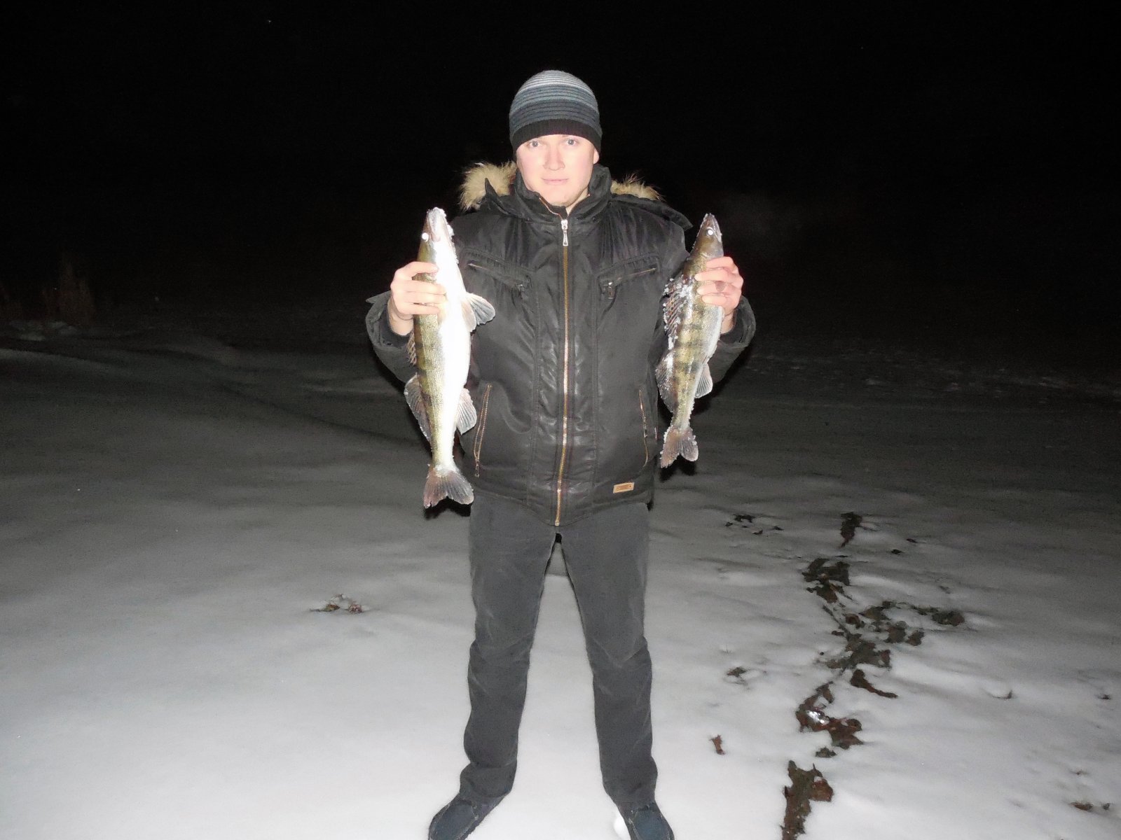 Открывали зимний сезон в субботу 12.01 в районе дамбы. На лед вышли около 8:00, выставили восемь жерлиц с магазинским карасиком и принялись, впервые в жизни, испытывать балансиры. До 15:00 похвастаться было нечем, поймали десятка два окуня-живца на мотыля, заработали несколько ударов и пару мелких судачков на балансиры, судачьи блесенки молчали. После трех часов взял бур и снова в поиски "большой рыбы", которую таки нашел, в течении десяти минут из одной лунки было два судака 1,1 кг, 2,1 кг и один сход на балансир LUCKY JOHN(полосатый на фото). Потом были еще удары, но дотемна так ничего и не зацепил. Спасибо огромное товарищу, который помог забагрить рыбу(в конце видео он достает щуку), т.к. свой багорик оставил возле жерлиц, со словами "взять зонт - дождя не будет". Жерлицы у нас молчали весь день, как оказалось, место для них было не совсем удачным, некоторые соседи выловили по 1-2 щуки, у некоторых тоже пусто. Количество пробуренных лунок стремится к сотне, впечатления отличные) Тестировал новую "мыльницу" , снял чуток видео.