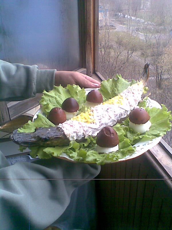 В один из приездов он как-то взялся приготовить щуку. И вместо того, чтобы потроха как обычно, выбросить, он взялся их жарить - печень, пузырь, икру, молоки - короче все, кроме жабер и кишок. Обвалял в муке, присолил, поперчил - объеденье! Никогда бы не подумал.