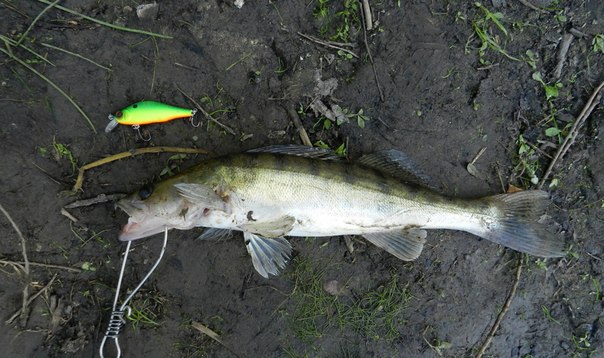 Вот как-то на Десне судачек днем попался, твичил твичил, без толку, провел пару раз медленной равномеркой, когда воблер иногда бился лопатой о дно, так как глубина 1-1,5 метра.. и вуаля..
