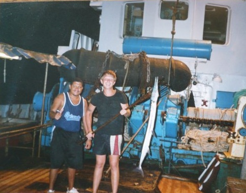Вот такое чудо было мной изловлено. Прошу прощение за браковскую снасть, но дело было на 4м месяце пребывания на арестованом пароходе на рейде Панамы и к тому времени мы уже все крючки и лески пообрывали, а кушать ну очень хотелось. Острога сварена стармехом из арматуры от ловушек для лобстера:D