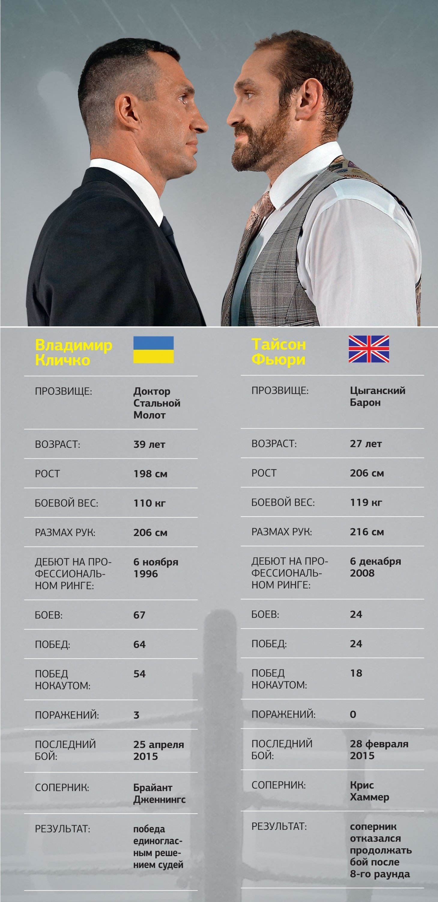 12 фактов о бое Кличко-Фьюри 1. Бой будет показан в прямой трансляции в 150 странах мира. В США транслировать поединок будет телеканал НВО, в Германии, Швейцарии, Австрии и Люксембурге — RTL, в Украине — Интер. Жители Великобритании будут смотреть бой в платном пакете телеканала Sky Sports Box Office. 2. Этим летом компания Владимира Кличко KMG (Кличко Менеджмент Групп) подписала новый контракт с немецкоязычным телеканалом RTL на его последующие пять боев. Первый по этому контракту поединок украинец проведет как раз с Фьюри. 3. По оценке немецких СМИ, за право трансляции одного боя RTL выплачивает около € 3 млн. Ожидается, что суммарные сборы этого поединка составят более € 15 млн. 4. За поединком на Esprit Arena будут следить 55 тыс зрителей. Стоимость билетов составляет от € 29 до € 890. В VIP-пакеты (€ 397, € 497 и € 890) также входят посещения приема до и после боя. 5. Болеть за Фьюри в Дюссельдорф прилетит около 5 тыс. британцев, которые арендовали семь секторов стадиона и несколько первых рядов VIP-секторов. 6. Боксерское прозвище Фьюри — Цыганский Барон — неслучайно: в нем действительно течет кровь ирландских цыган. Кличко прозван Доктором Стальным Молотом за силу своих кулаков. 7. Для украинца это 19-я чемпионская защита подряд, и он второй по этому показателю в истории профессионального бокса. Рекордсменом является легендарный Джо Луис, который провел 25 успешных защит чемпионского титула подряд с 1938 по 1950 год. 8. Владимир Кличко не знает поражений уже 11 лет. Последний раз судья поднял руку его соперника 10 апреля 2004 года, и этим счастливчиком был американец Ламон Брюстер, который уже давно завершил свою активную карьеру. 9. В ринг Кличко традиционно выйдет под композицию Can’t Stop американской рок-группы Red Hot Chili Peppers. А перед боем зрителей разогреет британский певец Род Стюарт. 10. Фьюри с ростом 206 см станет самым высоким соперником для Владимира Кличко в его профессиональной боксерской карьере. Несколько лет назад британец приезжал в тренировочный лагерь украинца как спарринг-партнер. 11. Тайсон Фьюри будет 13‑м соперником Владимира Кличко, который до встречи с украинцем не знал поражений на профессиональном ринге. Всем 12 предыдущим оппонентам (американцы Брайант Дженнингс, Кэлвин Брок и Наджи Шахид, россияне Александр Поветкин и Султан Ибрагимов, болгарин Кубрат Пулев, итальянец Франческо Пьянета, поляк Мариуш Вах, узбек Руслан Чагаев, нигериец Сэмюэл Питер, кубинец Элисео Кастильо и черногорец Зоран Вуечич) Кличко испортил послужной список, сменив в графе “поражения” ноль на единичку. 12. Последние 12 лет Владимир Кличко в среднем проводит по два боя в год. Чтобы побить легендарный рекорд Джо Луиса (25 успешных защит титула подряд), украинцу нужно боксировать до 2019 года.