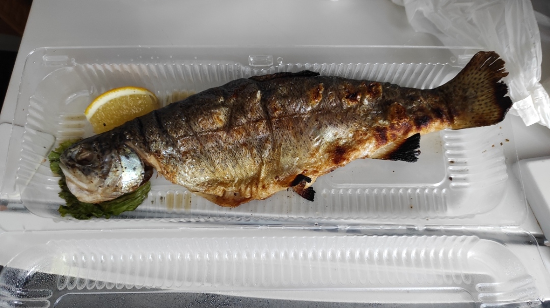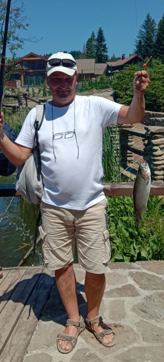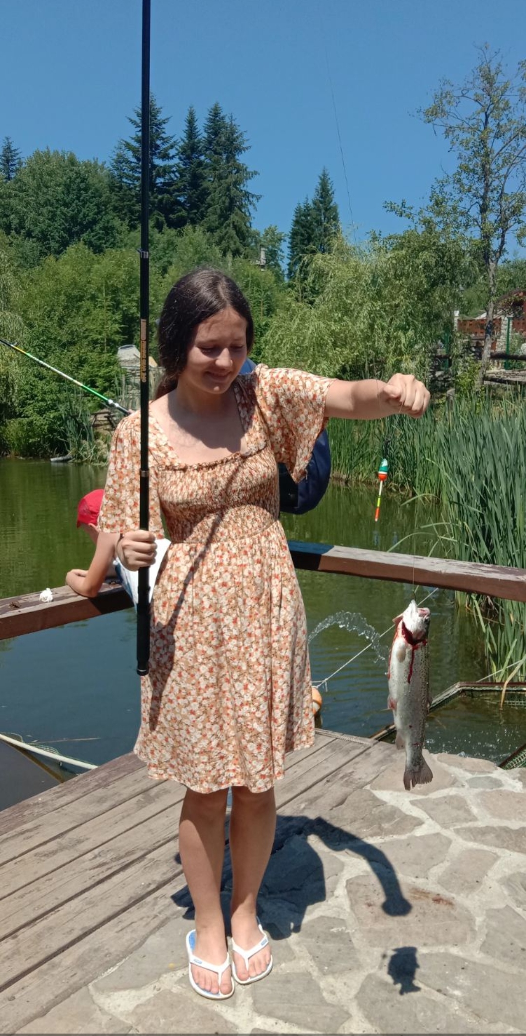 По случаю отпуска и нахождения с семьёй в Трускавце не мог не заехать в Схидницю на форелевое озеро. Рыбалка так сибе, но пришлось чуть чуть поиграться с проводкой, просто на стоячий поплавок брать не хотела, вообщем за 10 минут поймал одну на 500 грамм и дочке показал как она тоже поймала грамм на 400, которую отдали соседям. Нашу нам сразу и запекали на мангале.