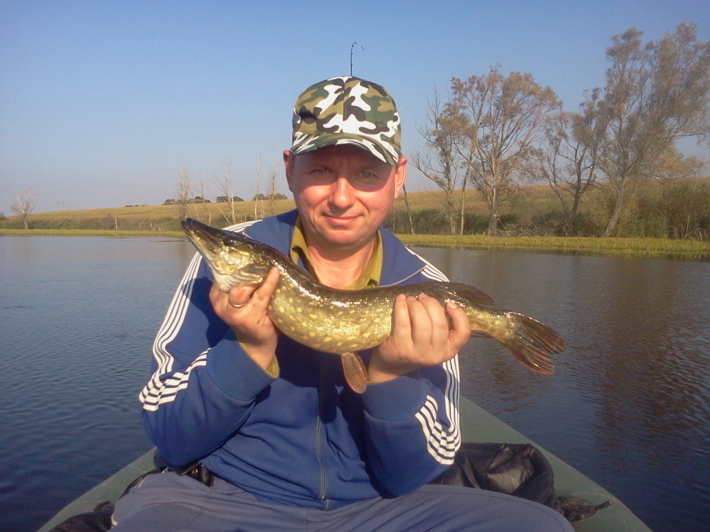 Всем доброго времени суток! Закончился отпуск, но было найдено время среди всей хозяйственной и строительной суеты у тещи))) чтобы мы с друзьями отправились на рыбалку с ночевкой, поболтать и попить водочки под ушицу. Когда я узнал, что в заброшенном ставу с плавунами протяженностью около 2х км. промышляют щука и окунь, я решил подготовиться посерьезней.Своего ничего из Кременчуга не брал, взял у однокашника спин (телескоп), катуху, купил леску 0,20, Jaxon valader 7,5 sm, Poper sea-monstr,пару вертушек и в бой. Прибыв во второй половине дня на место, выплыли по быстрячку за набором для ухи на карася и другую рыбу с удочками, но он нас игнорировал и отзывалась только красноперка на опарыша, я же со снаряженной палкой (инф.друзья не ловят хищника вообще) Со второго броска под куширь на попер выскочила "сарочка" в свечу, но промахнулась........Толк будет подумал я и через 3-5 мин пробросал данное место. Она (щука) вернулась и атаковала 2-й раз-удачно! Напарник помог подсачеком, парни обалдели от такой красивой атаки как собственно и я!(на фото будет слева 1.200) Затем начал пробрасывать в окна jaxon valader и выхватил парочку хороших "матросов". Смеркалось, но мысль о том как утречком выйду на "сару" не давала покоя. Уха под соточку удалась, пообщавшись о жизни и вспомнив былое- уляглись. А вот и зорька! Пока плыли я на тролинг джексоном поймал еще 3-х окуней, но где же сара? Около притопленного куста из палок прогалина, я туда засылаю воблер и тут удар (ошибку прошлой рыбалки не повторю подумал я ) и начал быстро вываживать, есть, все, "сарочка" в подсаке! Вот так на добротной ноте и закончили рыбалочку. Фото прилагаю. Всем НХНЧ!