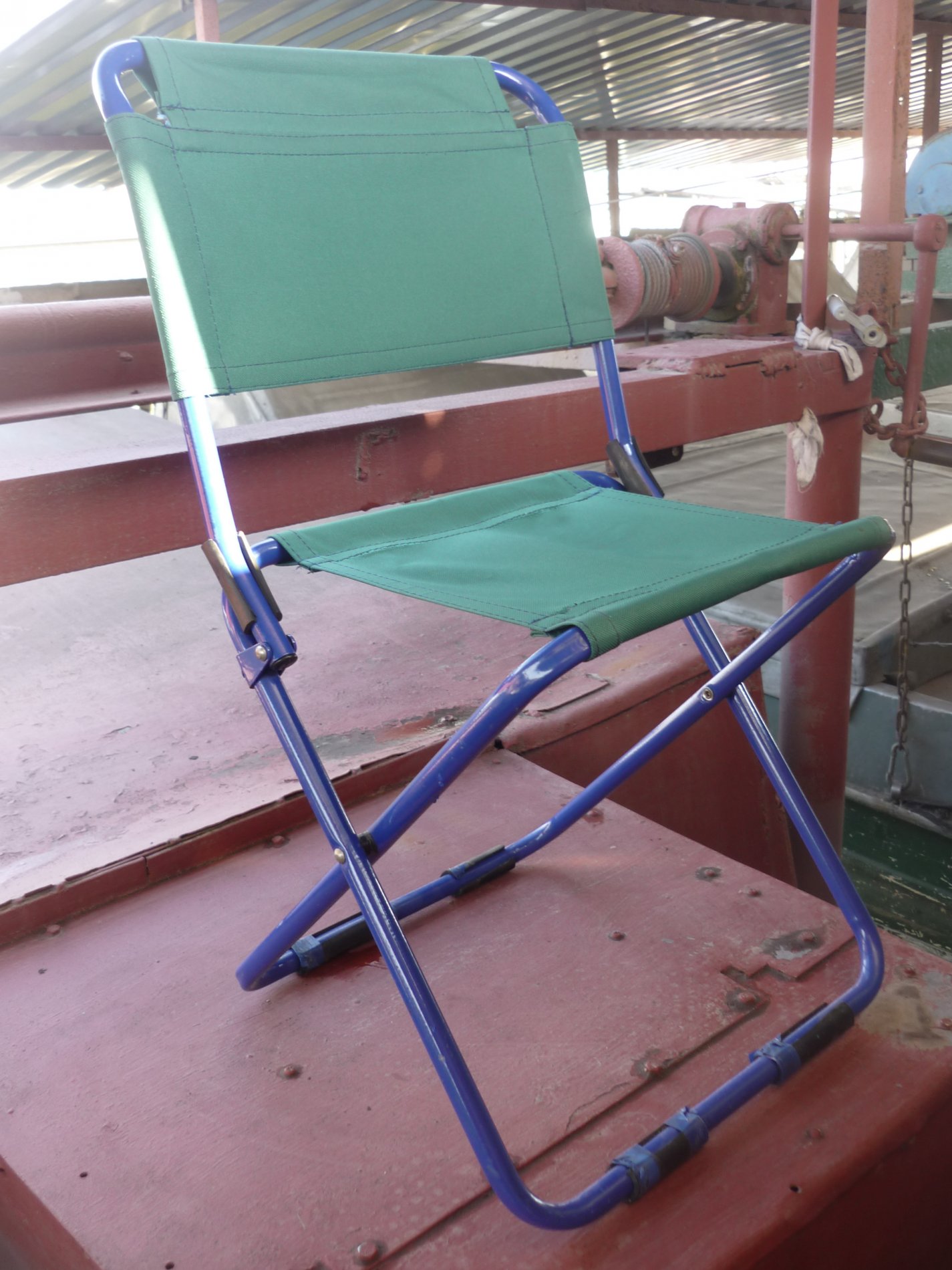Второй стул тоже удобный, складной мой бараний вес держит отлично. Плюс что у него есть подлокотники, вес 2.3 кг, компактный, беру его когда выезжаю с семьёй на отдых. Тоже хранится на причале, второй новый есть дома.