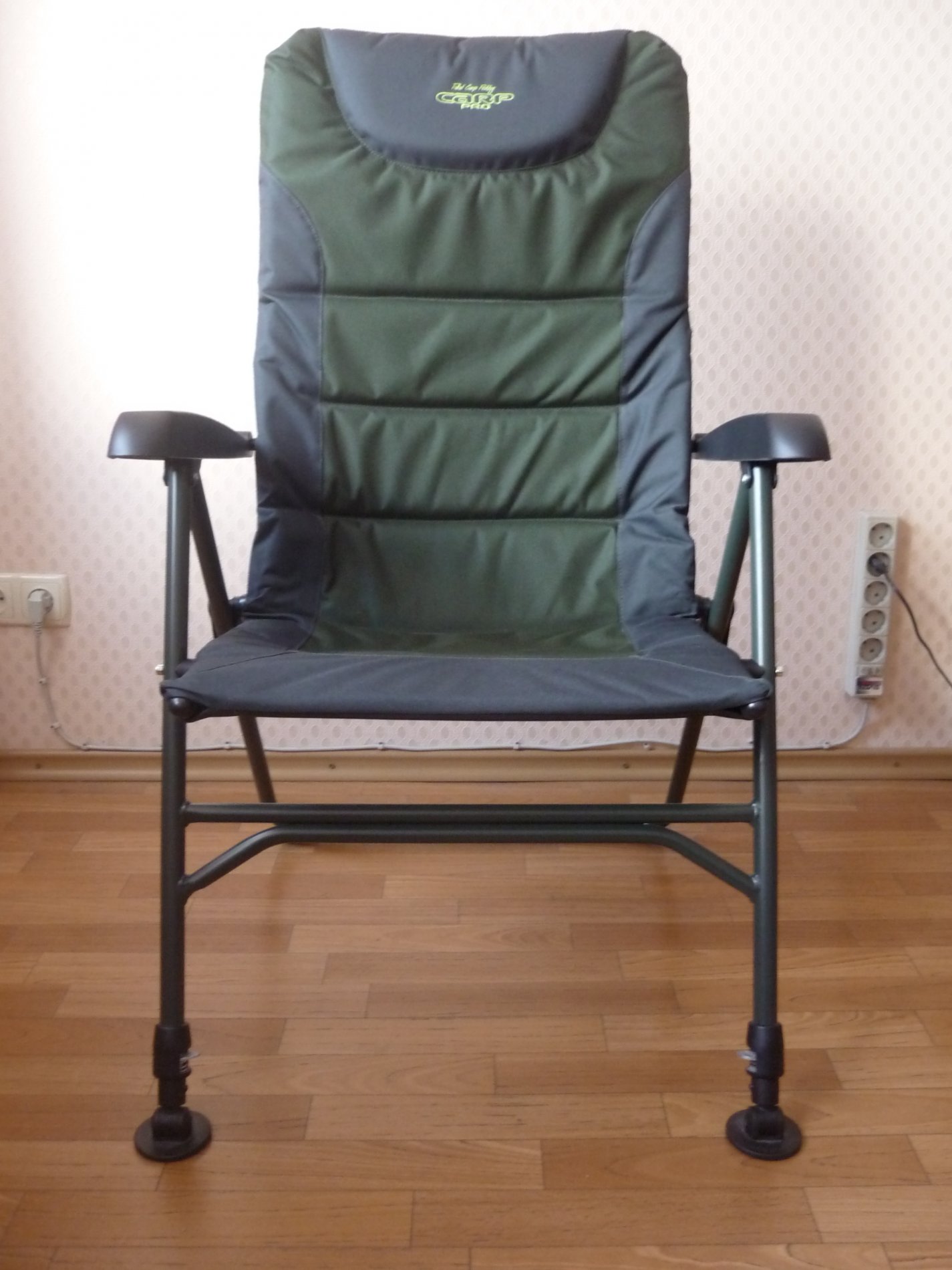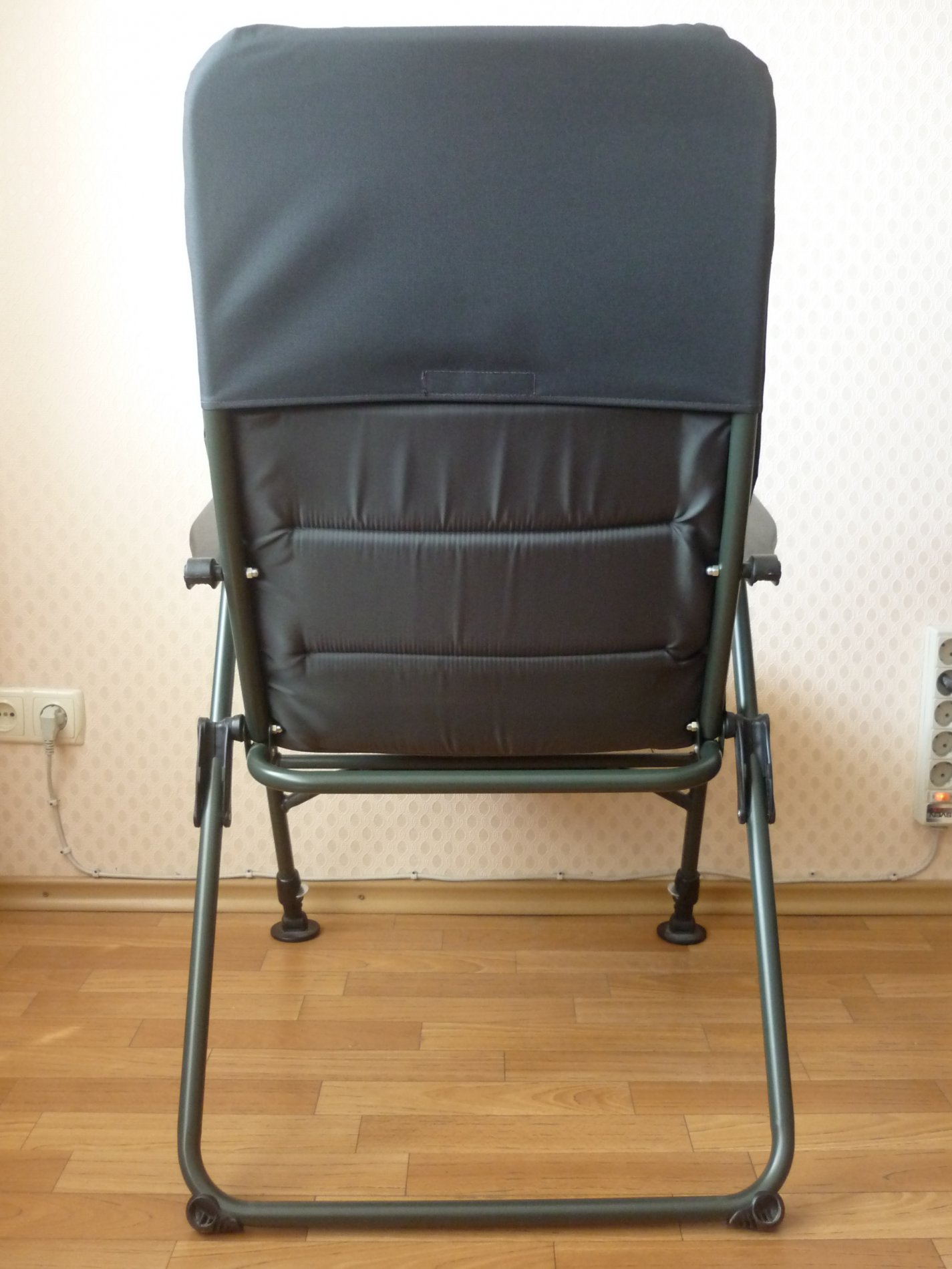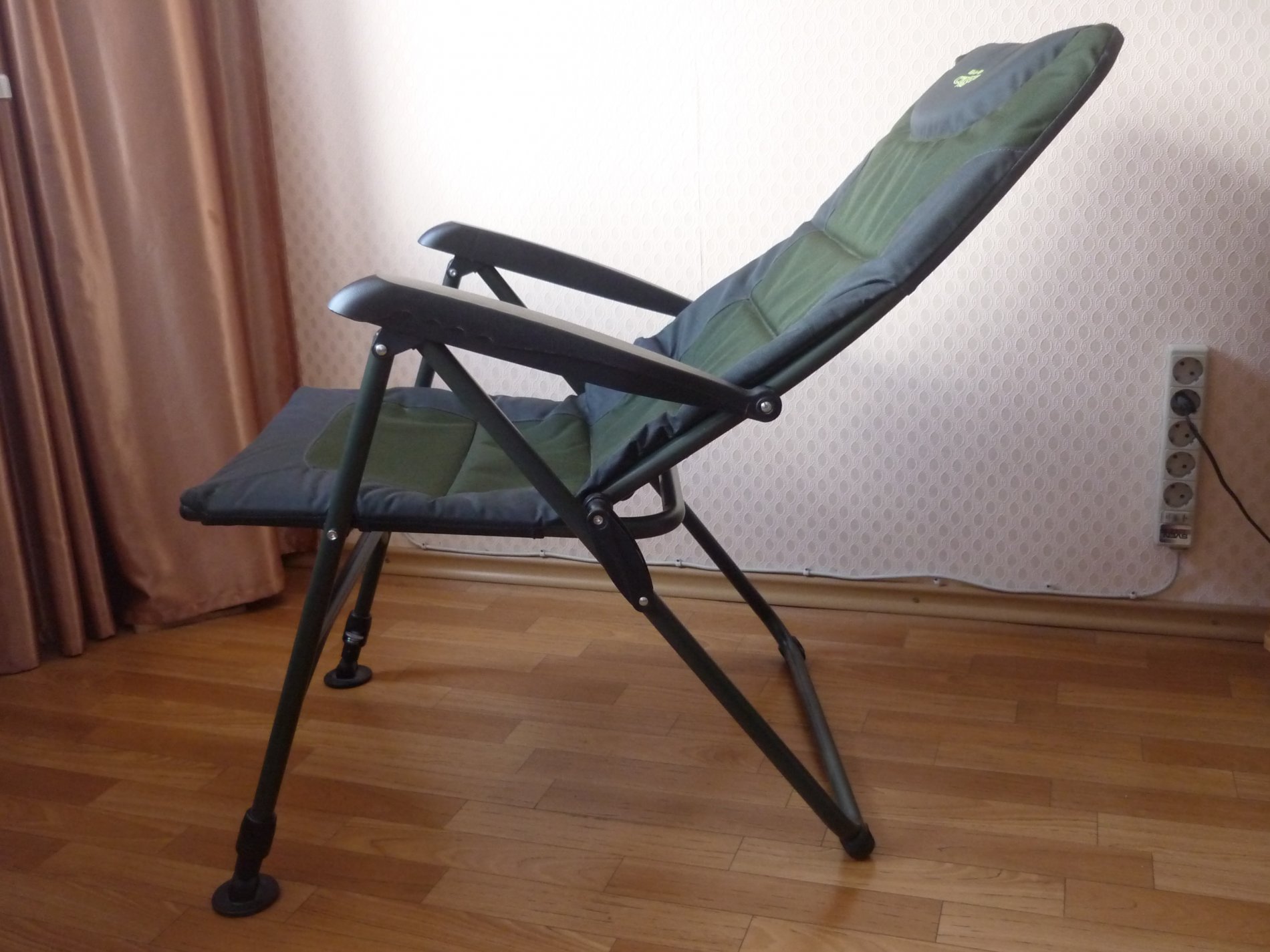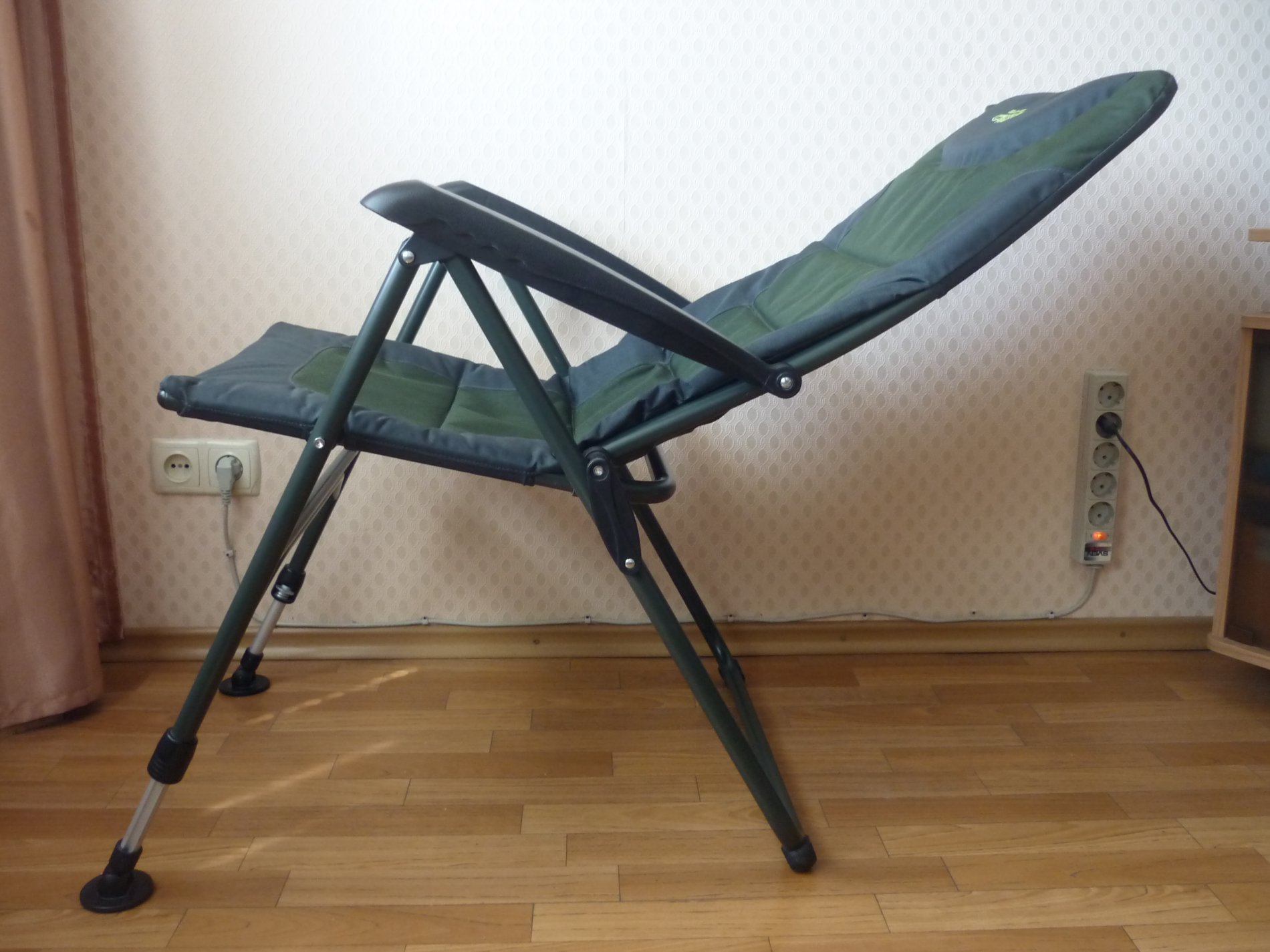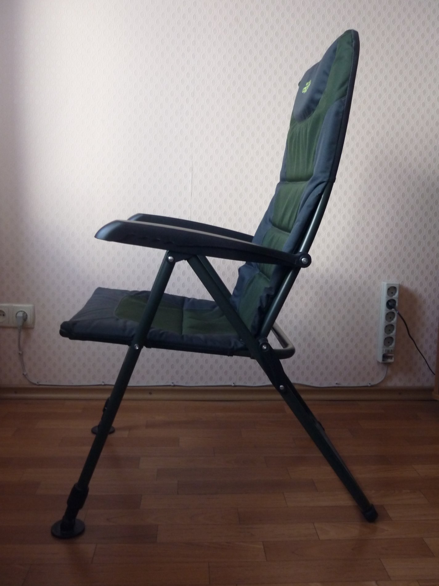 Третий стул был куплен специально для длительных сессий. Очень понравился качеством и функционалом. Это уже кресло - шезлонг с регулировкой наклона спинки. Имеет 5 положений наклона спинки, спинка почти 70 см., удобные подлокотники, для моего роста голова почти не выходит за спинку. Также передние ножки регулируются по высоте на 10см. Но есть и минус - это его вес 5.3кг и габариты, даже в сложенном виде его неудобно перевозить. На рыбалку пока не брал, зато уже 1.5 года сижу за ним перед компьютером, очень удобное, надеюсь когда-то применю его и на рыбалке.