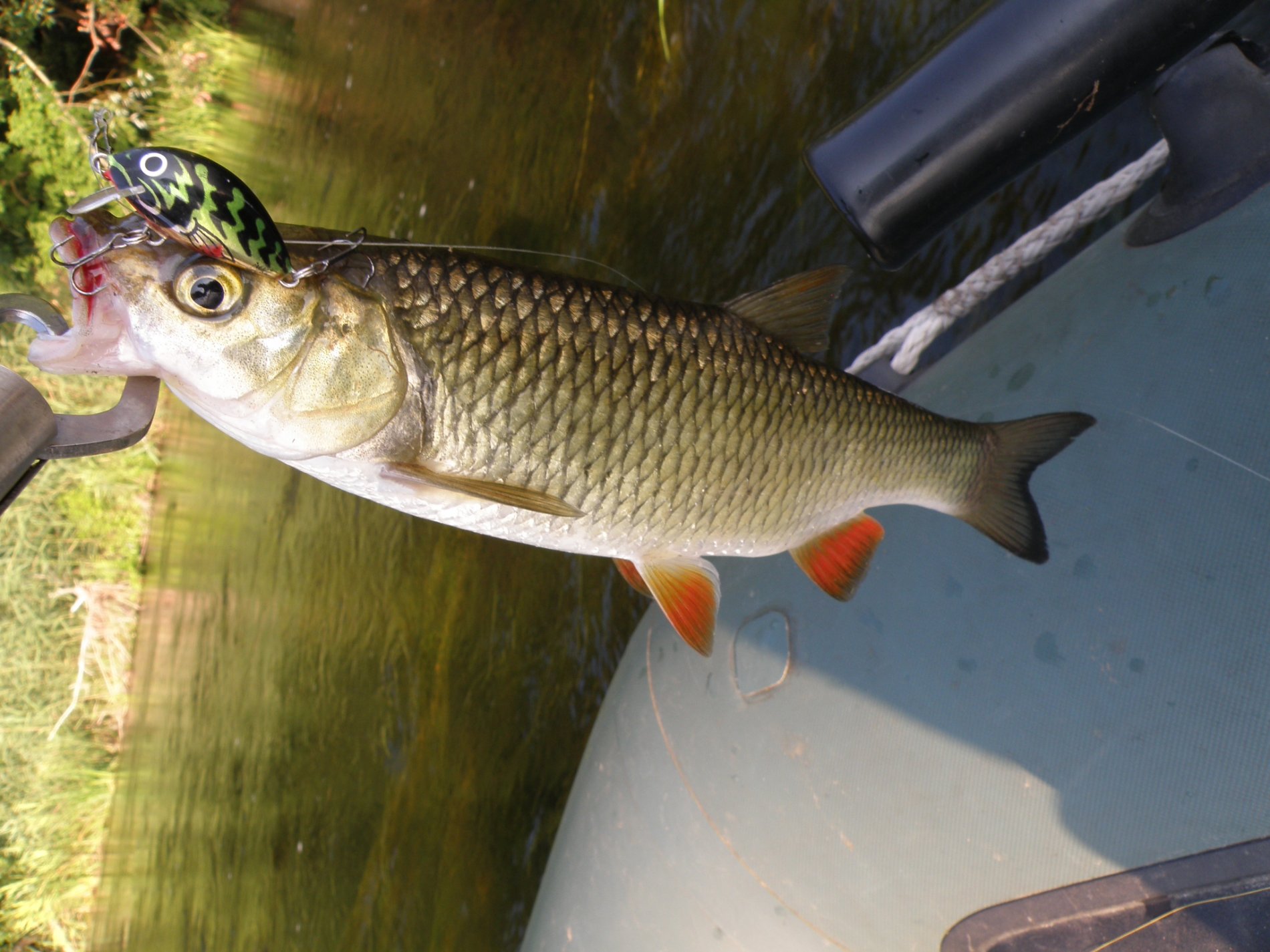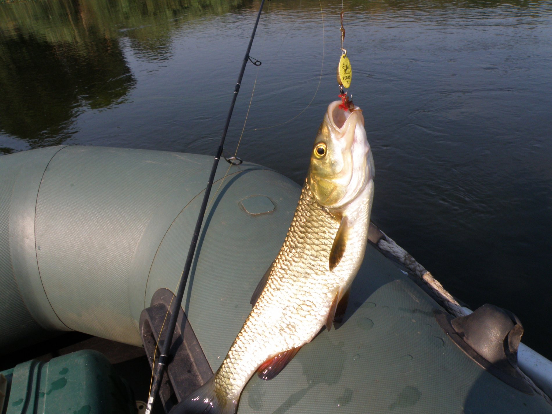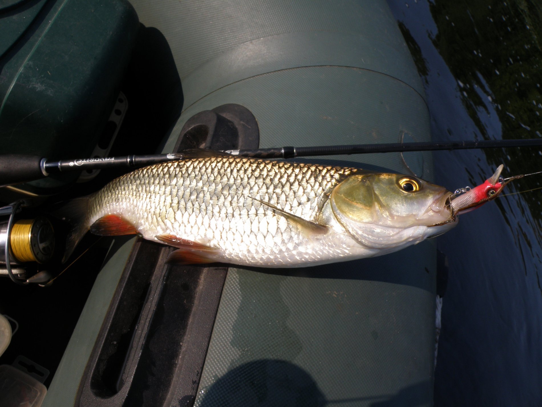На второй день в 5.00 первый заброс. Окунь отозвался практически зразу, но не было ни жереха ни голавля. Решаю спуститься в конец переката. Заметив перспективное место стаю на якорь. Заброс под крону нависших веток дерева и как током на падении, подсечка и первый красавец голавль в руках. На этом якоре у меня было 14 (четырнадцать) поклевок голавля, 9 реализованных. Рыба в пределах 500 грамм, достойные соперники. Затем все естественно затихло. Спускаюсь практически под конец переката, и снова голавлиные поклевки не заставили себя ждать. проскакивал приличного размера окунь, а вот жереха нет. Прорыбачив так до 11 часов, гребу как бурлак с лодкой через перекат к его началу там где вчера был жерех. Первый заброс, второй и удар. Но это вновь голавь, затем снова и снова голавль, жерех попался на второй день только один. Практически все поклевки из разряда отдай спиннинг!