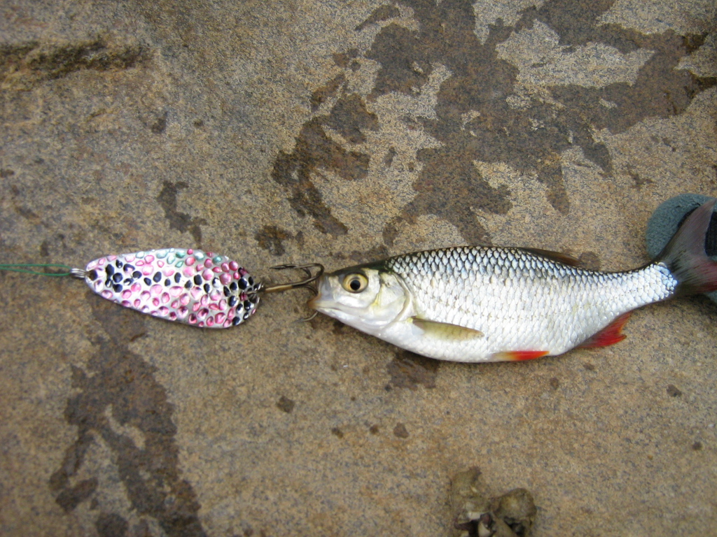 После сытного обеда и нескольких тостов "За рыбалку", все вновь ухватились за спиннинги.Время шло, а рыбы не было...Sywooch с Валентином на лодке пробовали ловить возле острова.Ленднивер и Sabat прочесывали прибрежные воды.SoffT, после недолгих скитаний вдоль берега, вернулся на то место, где утром были замечены всплески хищника.Добрая сотня забросов сделанных утром не принесли никакого результата, но надежда, что хищник еще там, все-таки была.Заброс, второй, тротий...Ничего...Часто багрится мелкая (4-5 см) плотвичка...Внезапно, после очередного заброса, на противоположном конце шнура что-то почувсвовалось."Окунек" - мелькнуло в голове, но мелькнуло как-то неуверенно - не похоже на окуня.Подняв рыбу из воды он стоял еще некоторое время тупо смотря на 15ти сантиметровую белую рыбку с красными плавниками.Поразило не сколько то, что клюнула красноперка, сколько, то что клюнула она на колебалку немного меньшую чем она сама!В течении часа таких поймалось еще 3 и только одна из них подбагрилась за хвост.Больше в тот день рыбы не было.Ни у кого.