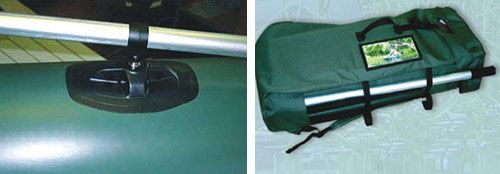 Сумка есть. Правда качество не ахти. Замок порвался через три месяца, внутри есть два ремня для закрепления скрученной лодки. Сам сильно не потаскаешь, а вдвоем нормально. Ну и понятно, что сумка это не рюкзак, поэтому если недалеко до воды то покатит.