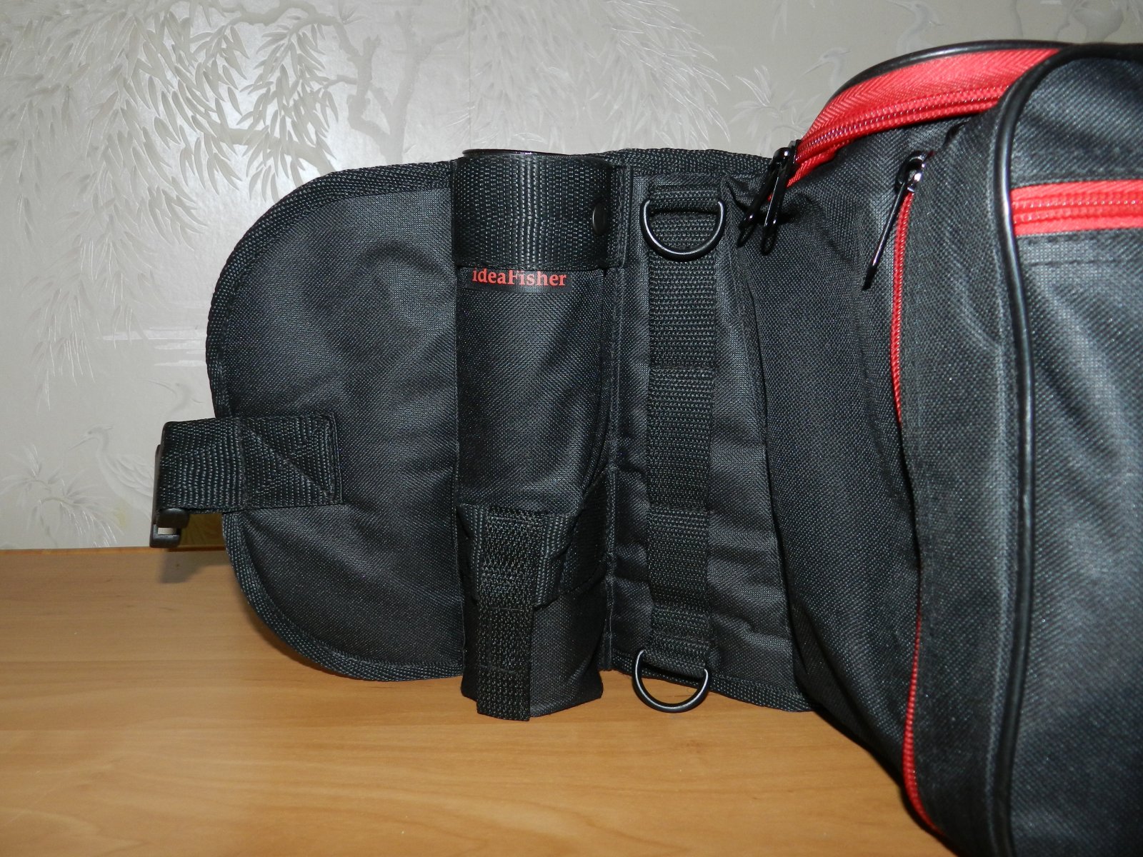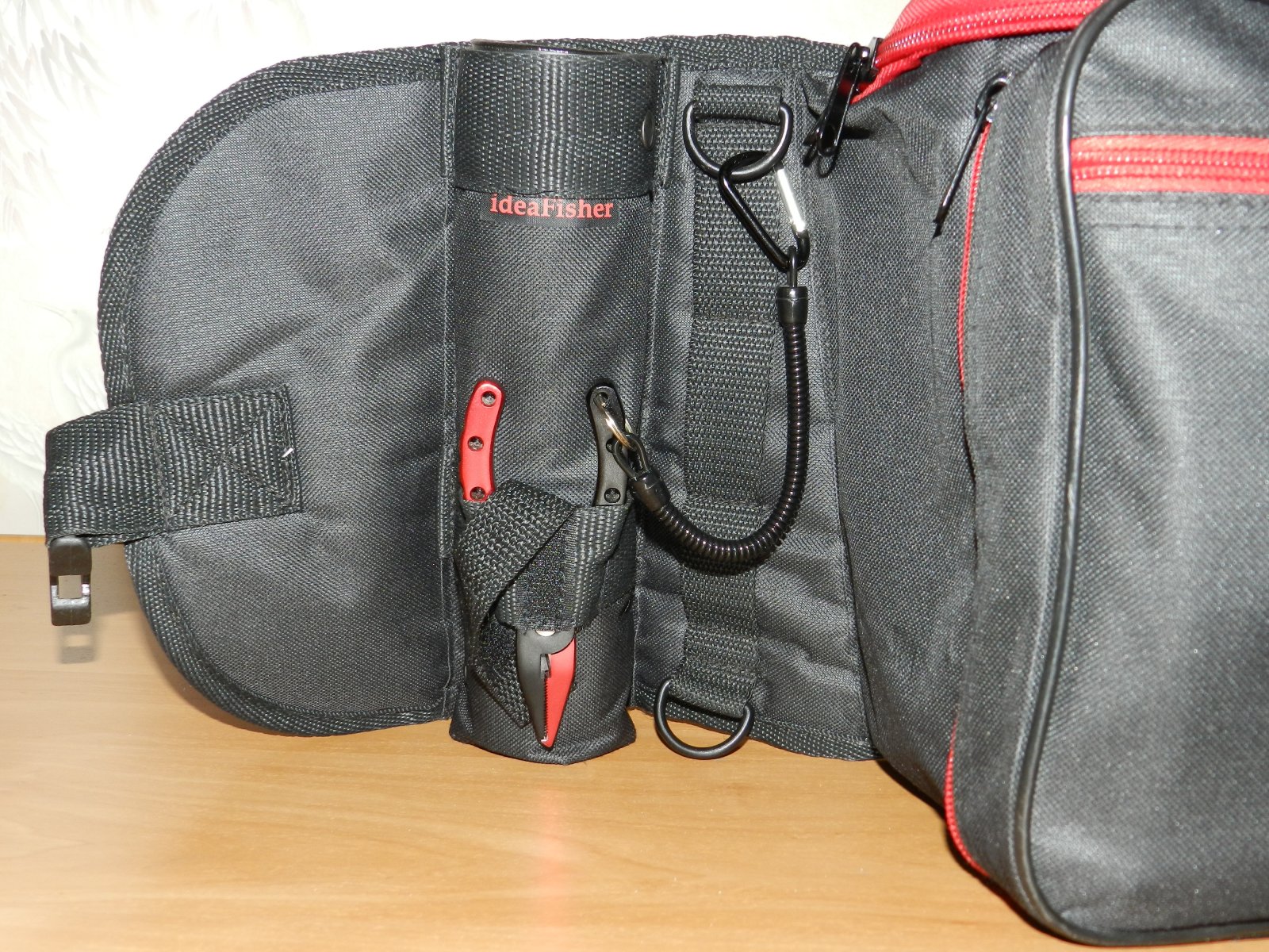 С права на сумке находится подстаканник для удилища, который радовал меня всю рыбалку в забродных штанах. Ни при смене приманки, ни при снятии рыбы с крючка бланк абсолютно не мешал. Там же находится держатель для "кусачек" куда отлично поместились кусачки Favorite, которыми я и извлекал тройники из пасти рыбы. Удобно когда все под рукой и не надо рыть всю сумку. Так же там находится очень маленькая бирочка "ideafisher".. ребята пока скромные, а зря :)