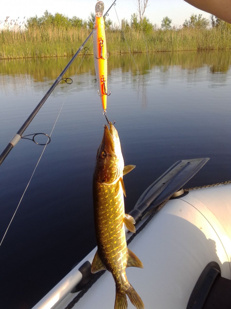 Сегодня с третей смены пашел в отпуск:ura:,и решил понавигировать:kayak: на Терновских разливах,на тех местах что Саня выложил в своем отчете.Приехал домой переоделся,схватил снасти,и в перед за хищником.В начале 6-го был на месте.Надул лодку и поплыл изучать водоем.Перешерстил все воблеры,нашол лидеров: орбит 110sp лимонник,и конечно Megabass vision 110sp,было поймано 2-е:predator: зубатых,и один зрелещный сход:wo_kakaya: свеча,и вытрусила воблер:фигасе:,размер(Терновский стандарт) 500-600 гр.