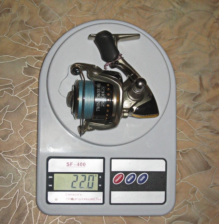 Реальный полный вес катушки:Shimano Twin Power 06 Mg 2500HGS с шнуром и бекингом.