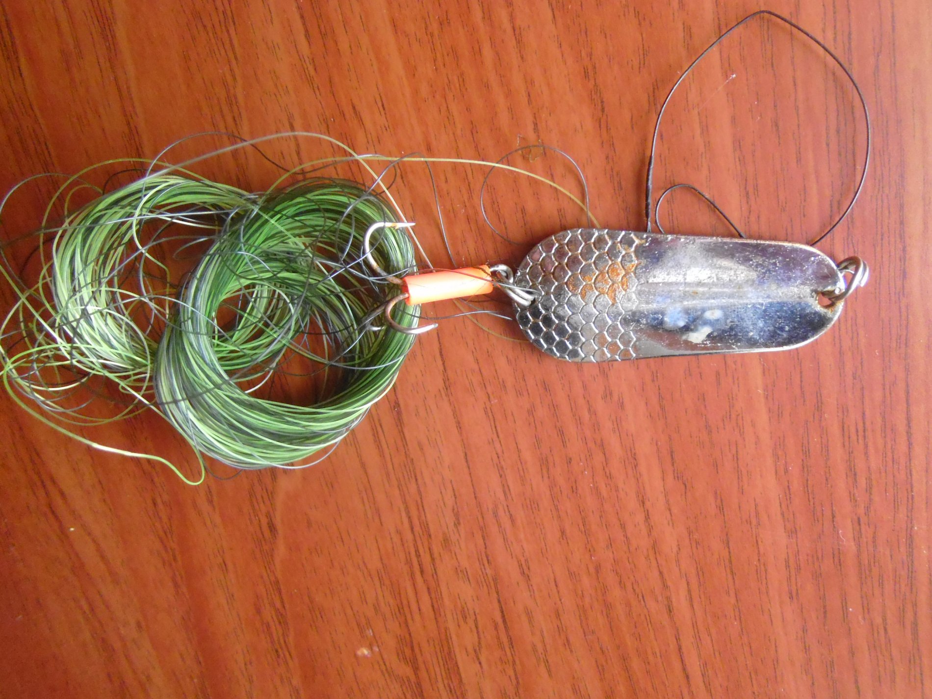 Сегодня на Цюрупинской Конке при ловле с поляны на донную снасть поймалась блесна - колебалка Джексон 40гр. с поводком и 10м. плетёнки. Вид довольно пристойный, плетёнка где то 0.2, приличное усилие надо что бы она оторвалась.
