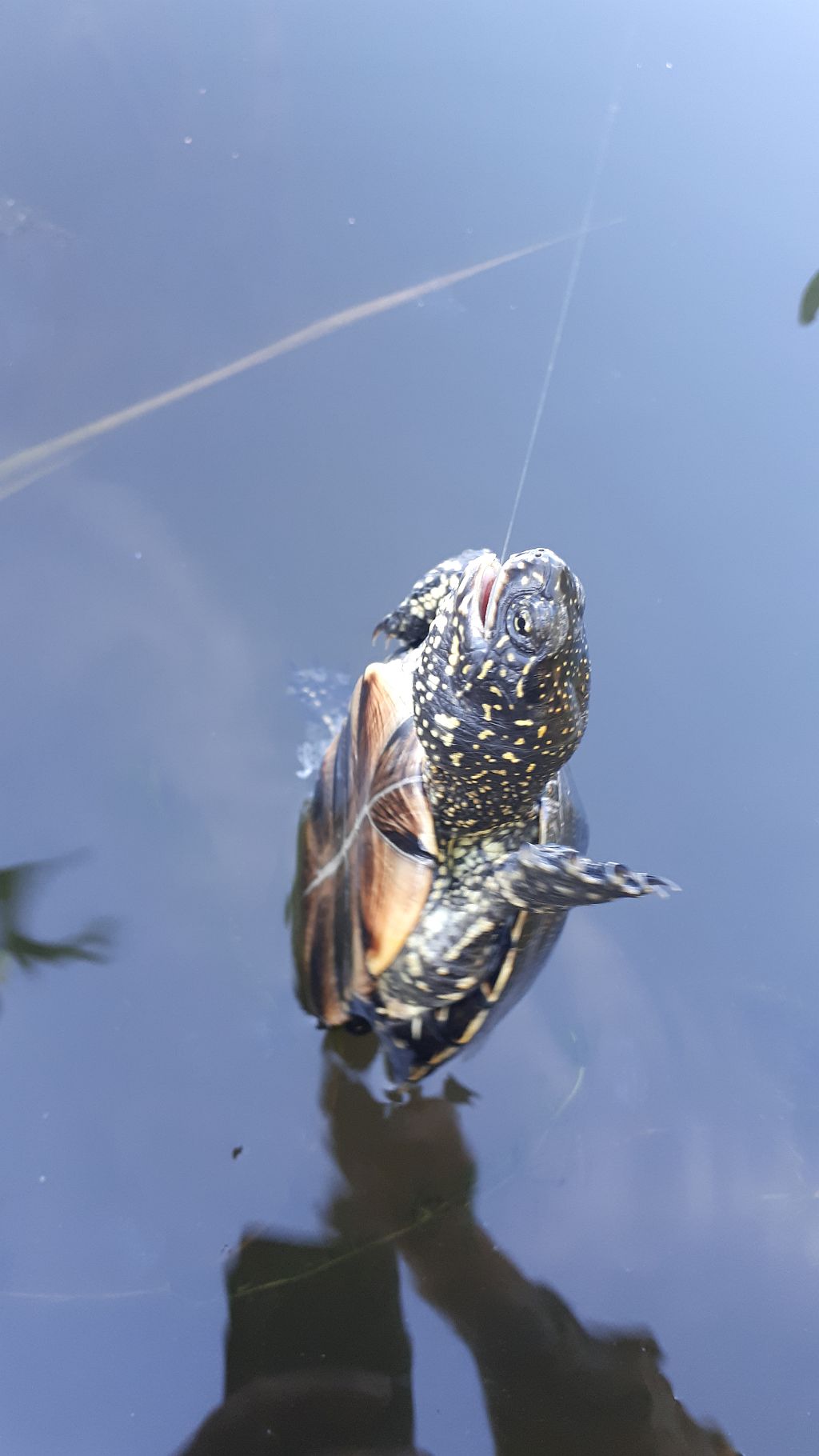 На бутерброд из белого и красного впервые на махалку поймал черепаху. Поклевка - "повело" с притапливанием поплавочка. Я по первой надежды не терял каким то каком гак вытянуть, но повозившись немного понял всю бесперспективность этого процесса. Голова тортилки упирается и втягивается в панцирь... Отрезал поводок максимально, уплыла с пирсингом, надеюсь, что каким-то природно-естественным образом черепаха от него высвободится , бедолага.