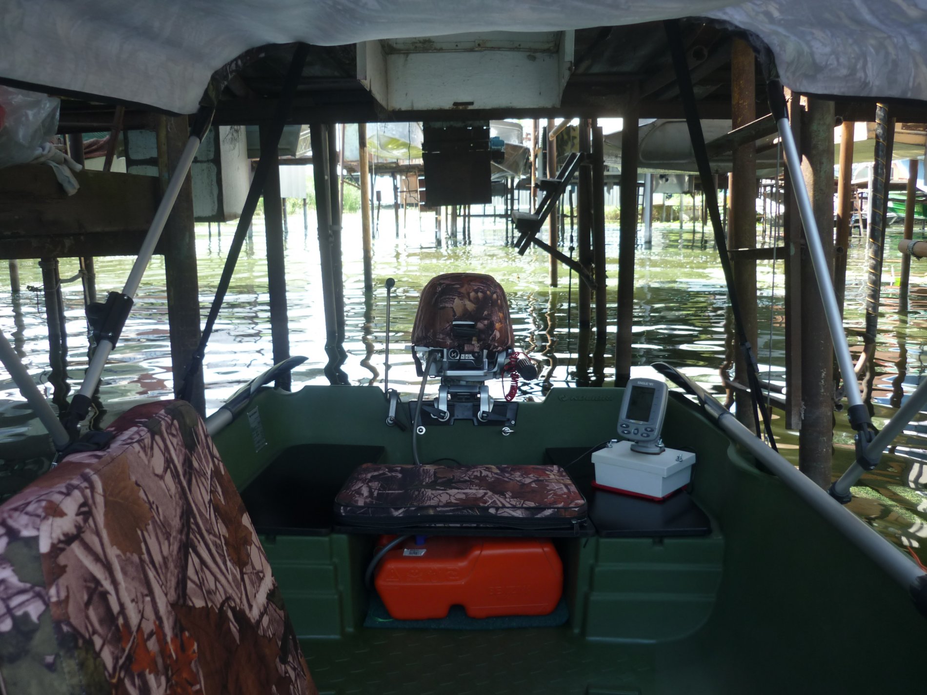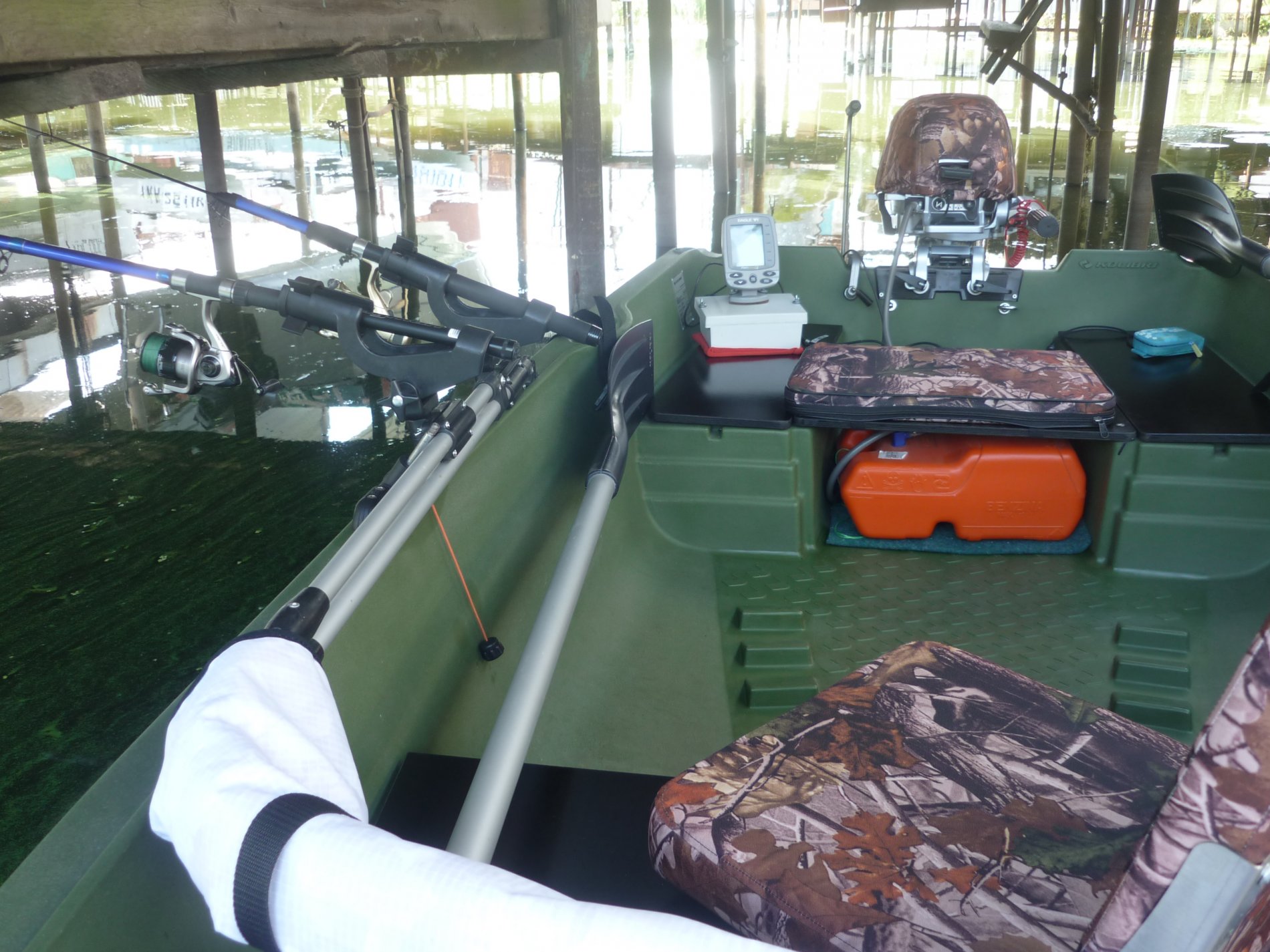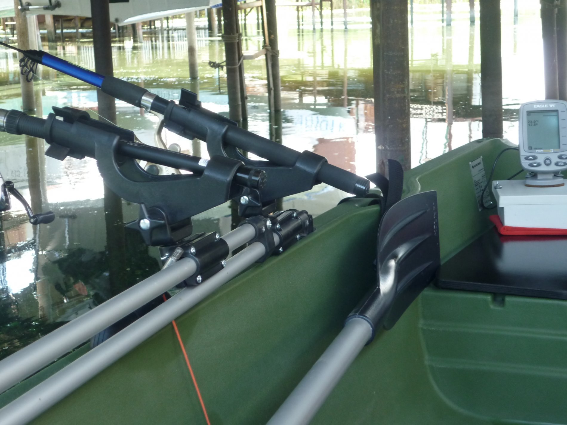 Всем доброго дня! Пошёл второй год эксплуатации лодки RKM-350. Пришло время подключить эхолот и установить держатели для спиннингов. Экран эхолота закрепил на пластиковом боксе, сам бокс можно переместить до передней банки.Крепления для держателей разместил 2 на левом борту для ловли под тентом и 2 на правом борту для ловли без тента, хотя без тента можно использовать все 4 точки крепления. Мнение о лодке не изменилось - рекомендую, для рыбалки очень удобна. Понравилось скромное потребление топлива, под Хондой 5 путевой расход топлива 1литр на 9.5 км.